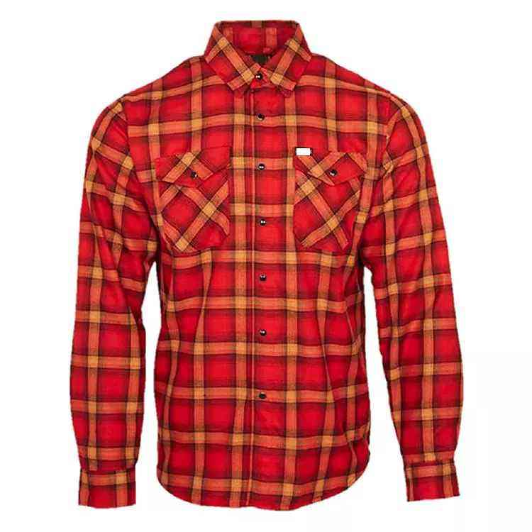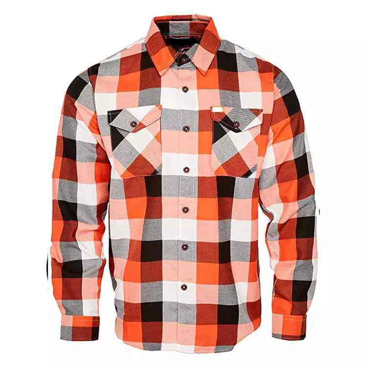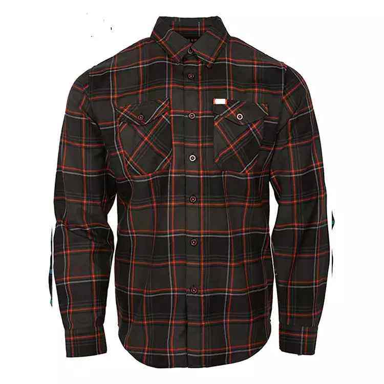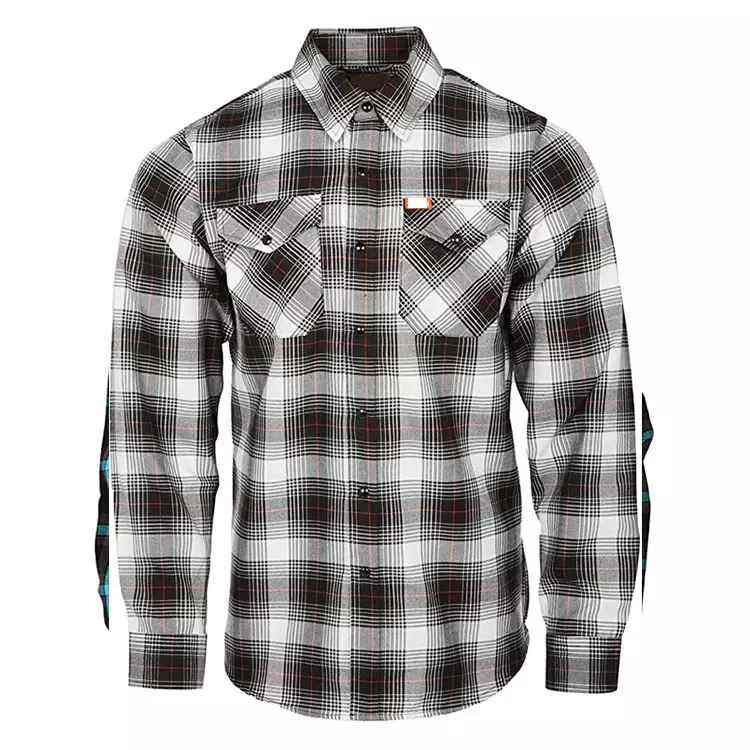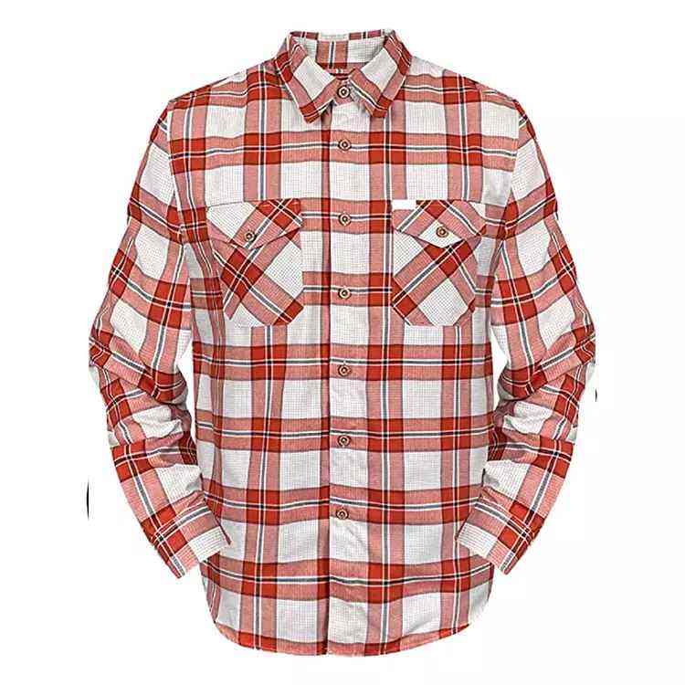 เสื้อเชิ้ตผ้าแฟลนเนลทรงโค้งแบบมีกระเป๋าปักโลโก้แบบกำหนดเองใหม่ เสื้อลำลองลายสก็อตสำหรับผู้ชาย ผ้าโพลีเอสเตอร์ผสมคอตตอน แขนยาว ป้องกันรอยยับ