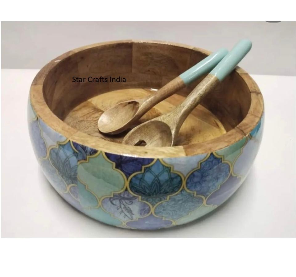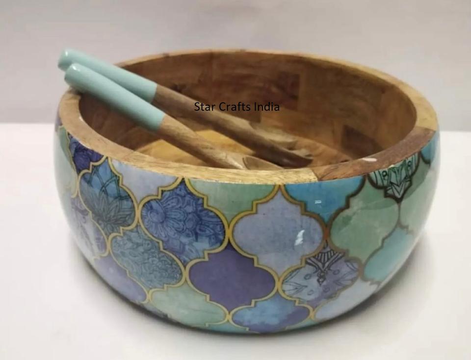 ชามเสิร์ฟอาหารทำจากไม้อะคาเซียธรรมชาติพิมพ์ลายลงยาในชามสลัดขนาดพิเศษ
