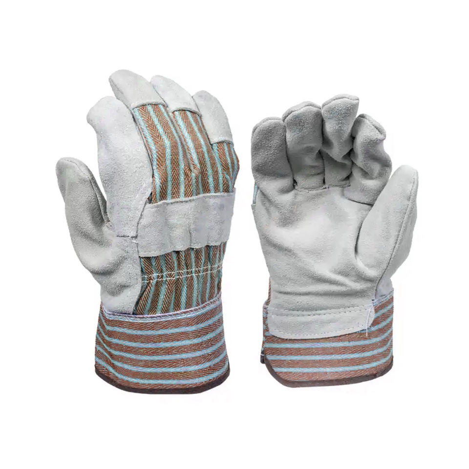 ถุงมือทำงานหนังวัวคู่แบบแยกนิ้วสำหรับรักษาความปลอดภัยถุงมือผ้าฝ้ายกันความร้อนปรับแต่งได้