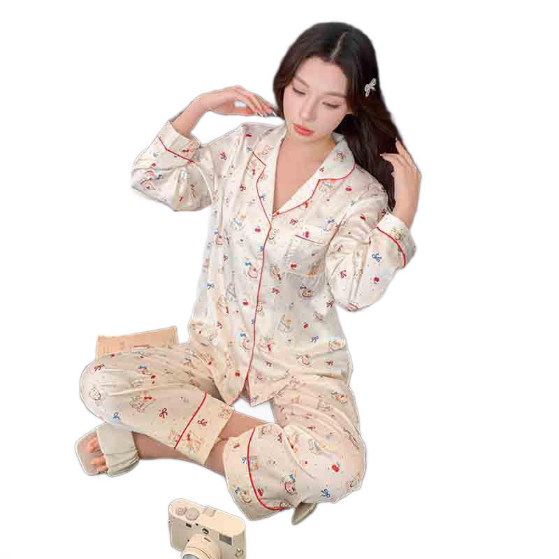 ชุดนอนแขนยาวลายการ์ตูนน่ารักใหม่เอี่ยม เอวยางยืด ใส่สบาย ระบายอากาศได้ดี เหมาะสำหรับฤดูใบไม้ผลิ ชุดลำลองสำหรับผู้หญิง สวมใส่สบายๆ อยู่บ้าน