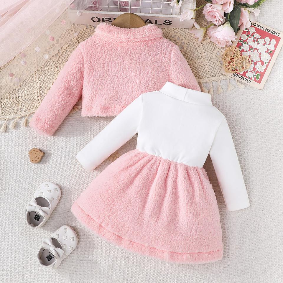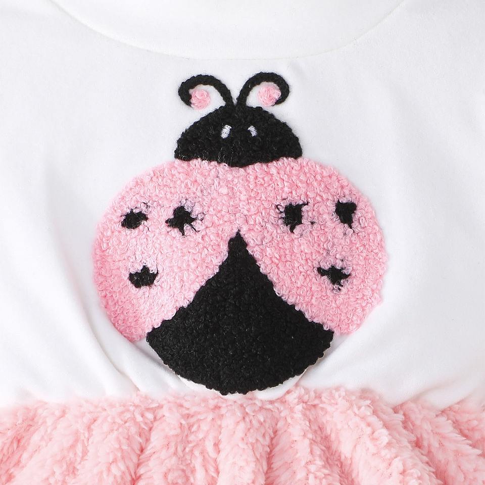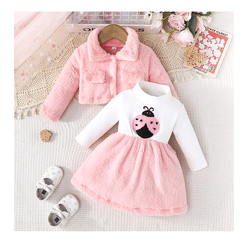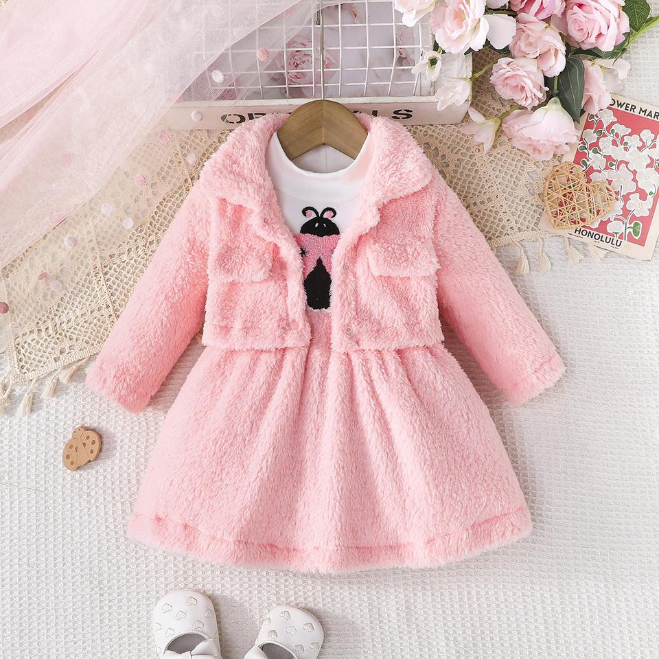 ชุดเดรสขนปุยแขนยาวน่ารักแบบใหม่ ชุดฤดูหนาวปักลายการ์ตูน ชุดเด็กสองชิ้น