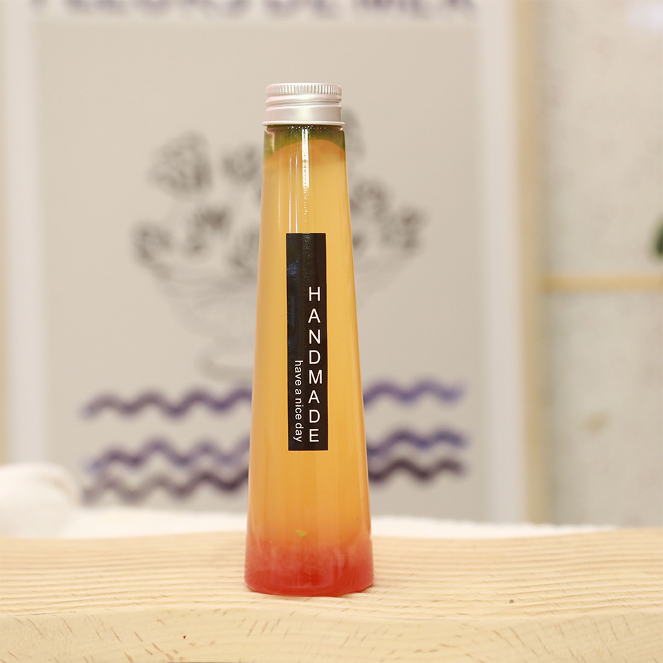 ขวดพลาสติก PET ทรงกรวย ฝาเกลียว พิมพ์สกรีน ขนาด 140 มล./200 มล./250 มล./300 มล./350 มล./450 มล. สำหรับน้ำผลไม้สดและชา