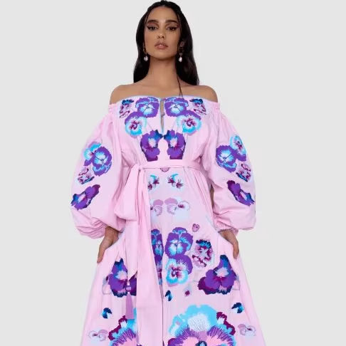 เดรสผู้หญิงปักลายดอกไม้ดีไซน์ใหม่เดรสเอวสูงแขนยาวมีเอกลักษณ์เปิดไหล่ทรงบอลลูน