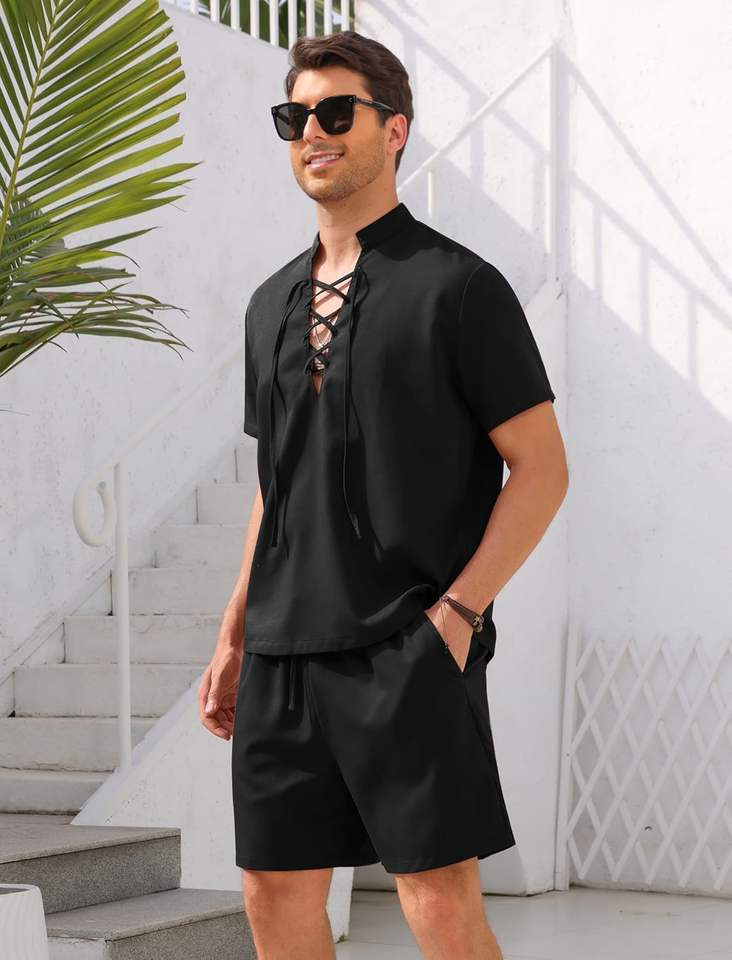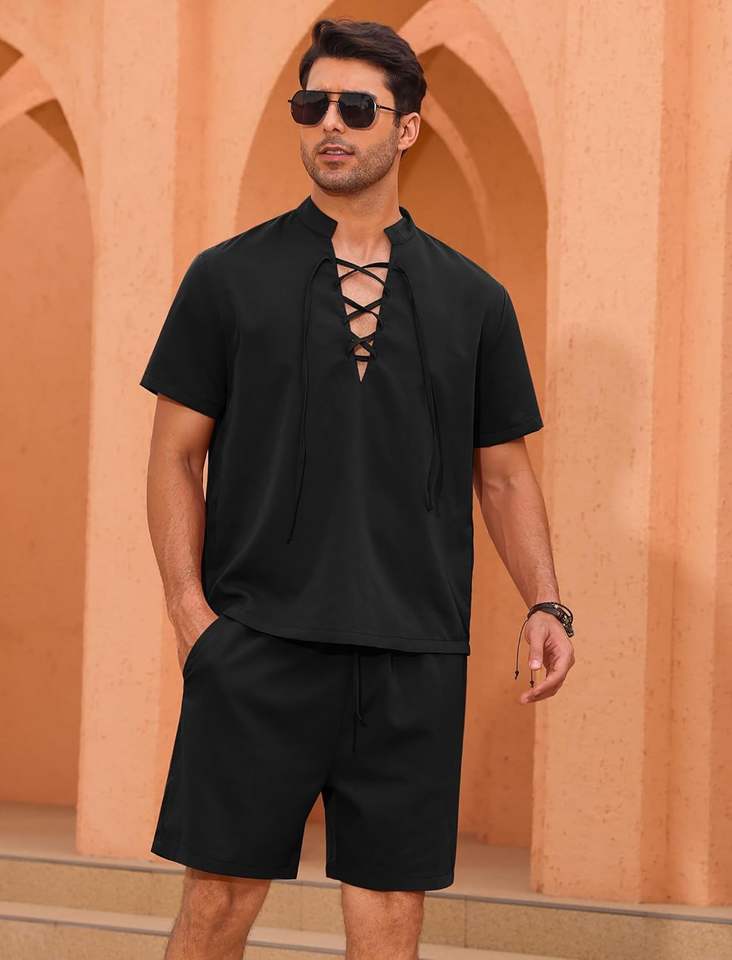 เซ็ตเสื้อยืดแขนสั้นและกางเกงขาสั้นสำหรับผู้ชายชุดเสื้อผ้าสองชิ้น100% ทำจากผ้าฝ้ายดีไซน์ใหม่สำหรับฤดูร้อน2025