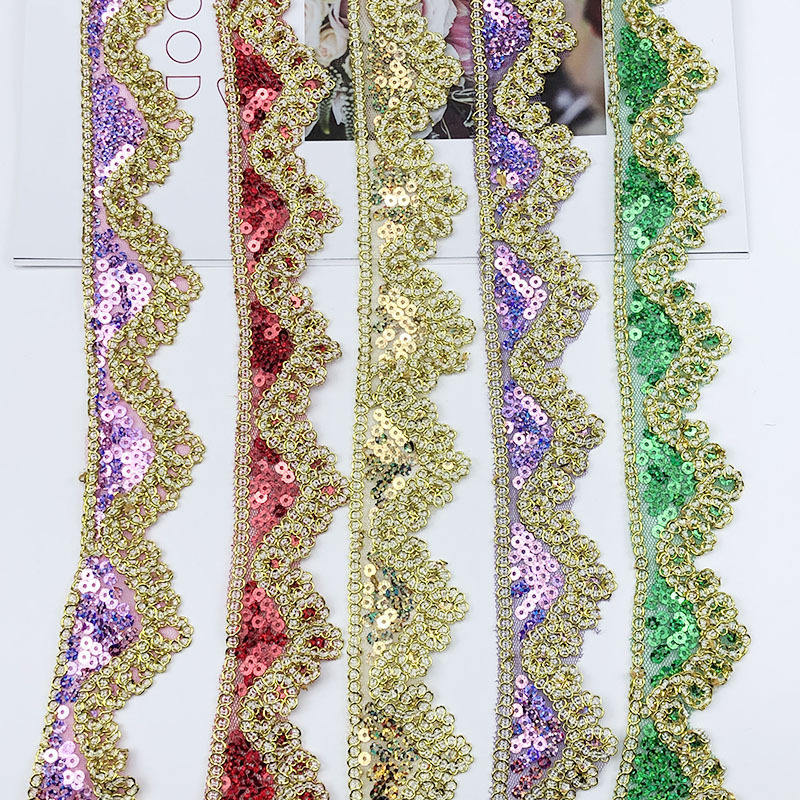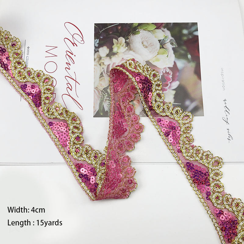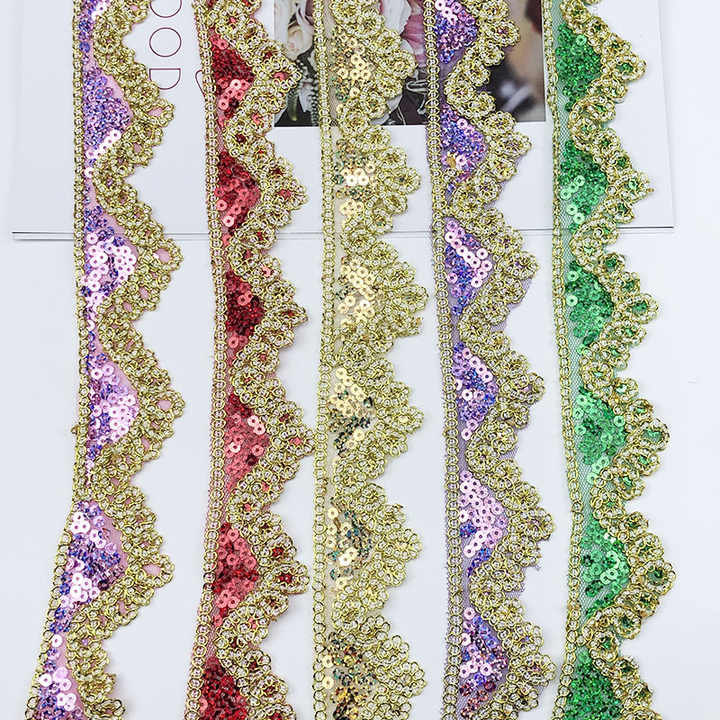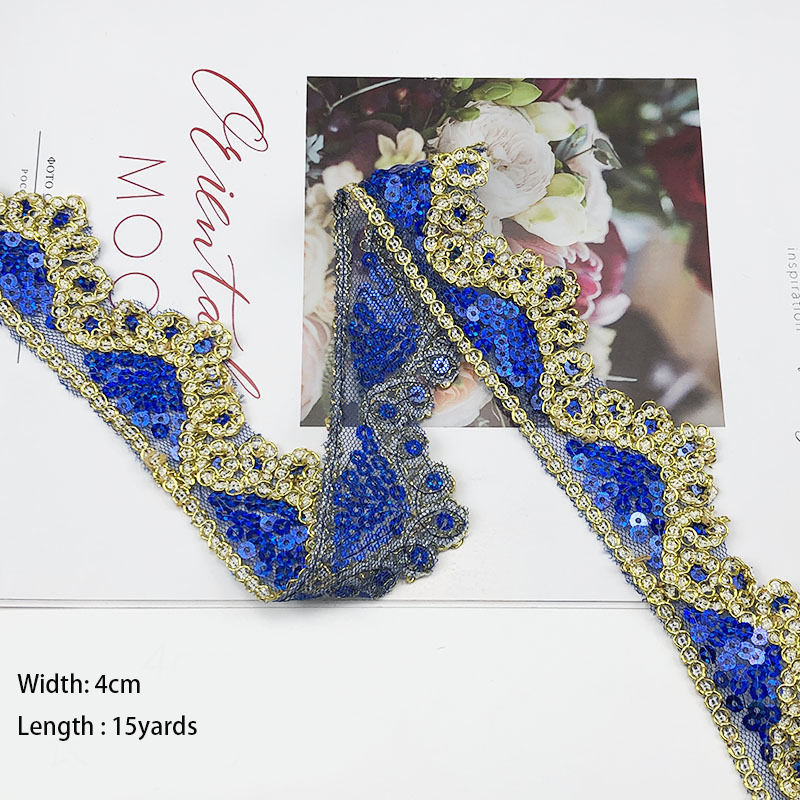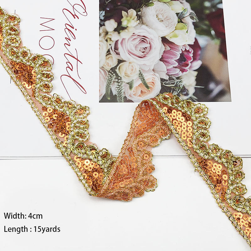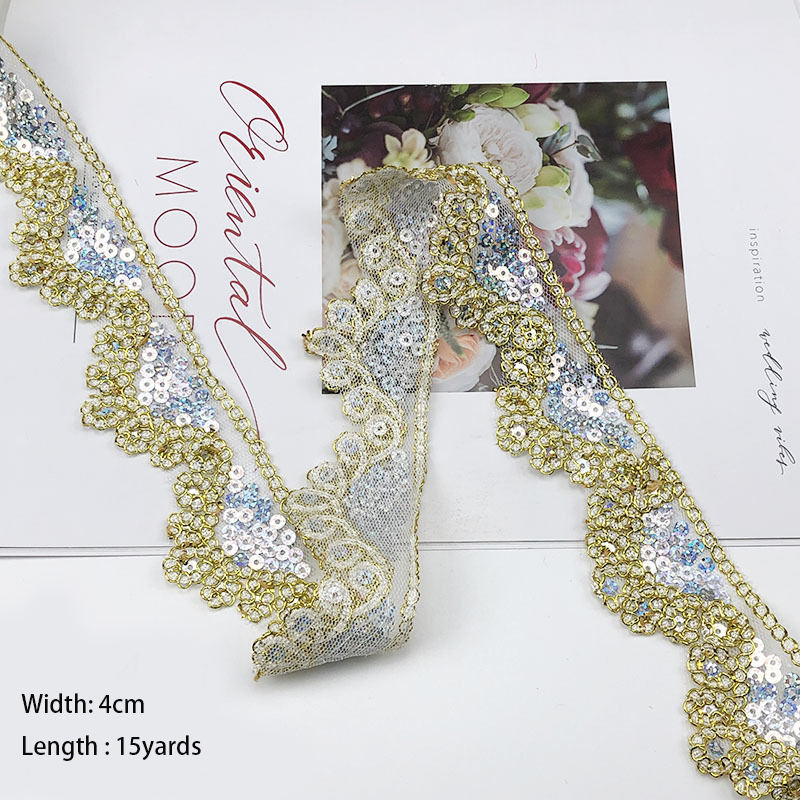 ตาข่ายประดับเลื่อมแวววาว4ซม. ดีไซน์ใหม่,ผ้าลูกไม้ปักเลื่อมสีทองเมทัลลิค