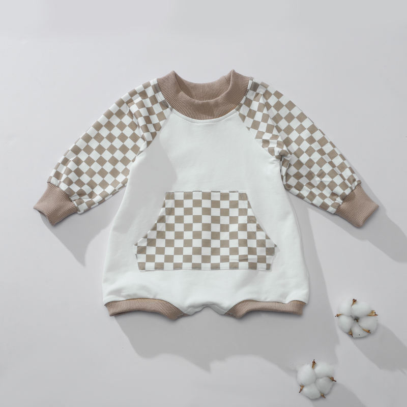 ชุดรอมเปอร์เด็กทารก ลายสก็อต สีเบจ สีกากี แบบใหม่ ชุดจั๊มสูทเด็กแรกเกิด