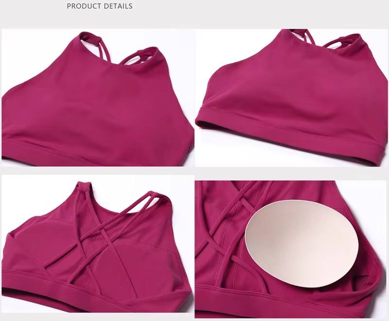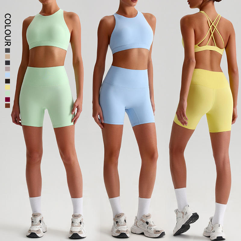 ชุดออกกำลังกายแบบ 2 ชิ้น เสื้อชั้นในกีฬาแบบไขว้หลังดีไซน์ใหม่ กางเกงขาสั้นยกกระชับสะโพก ชุดวิ่ง ชุดโยคะ