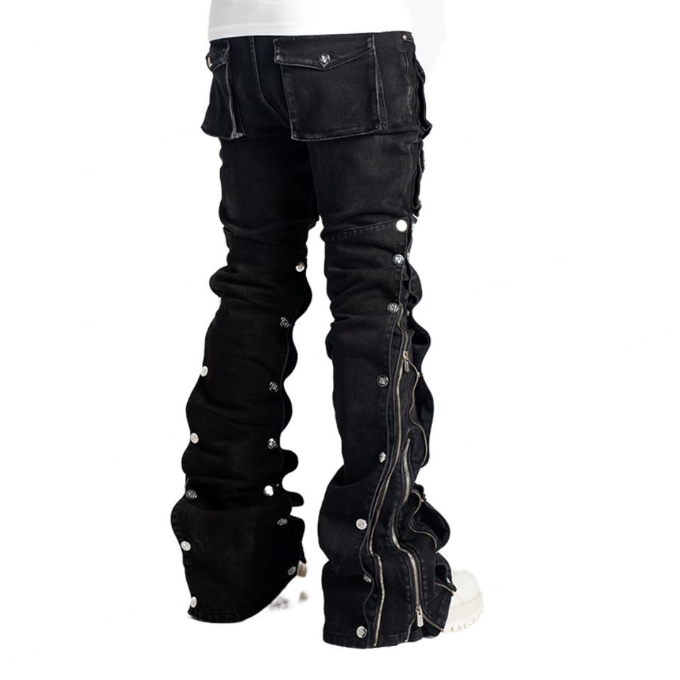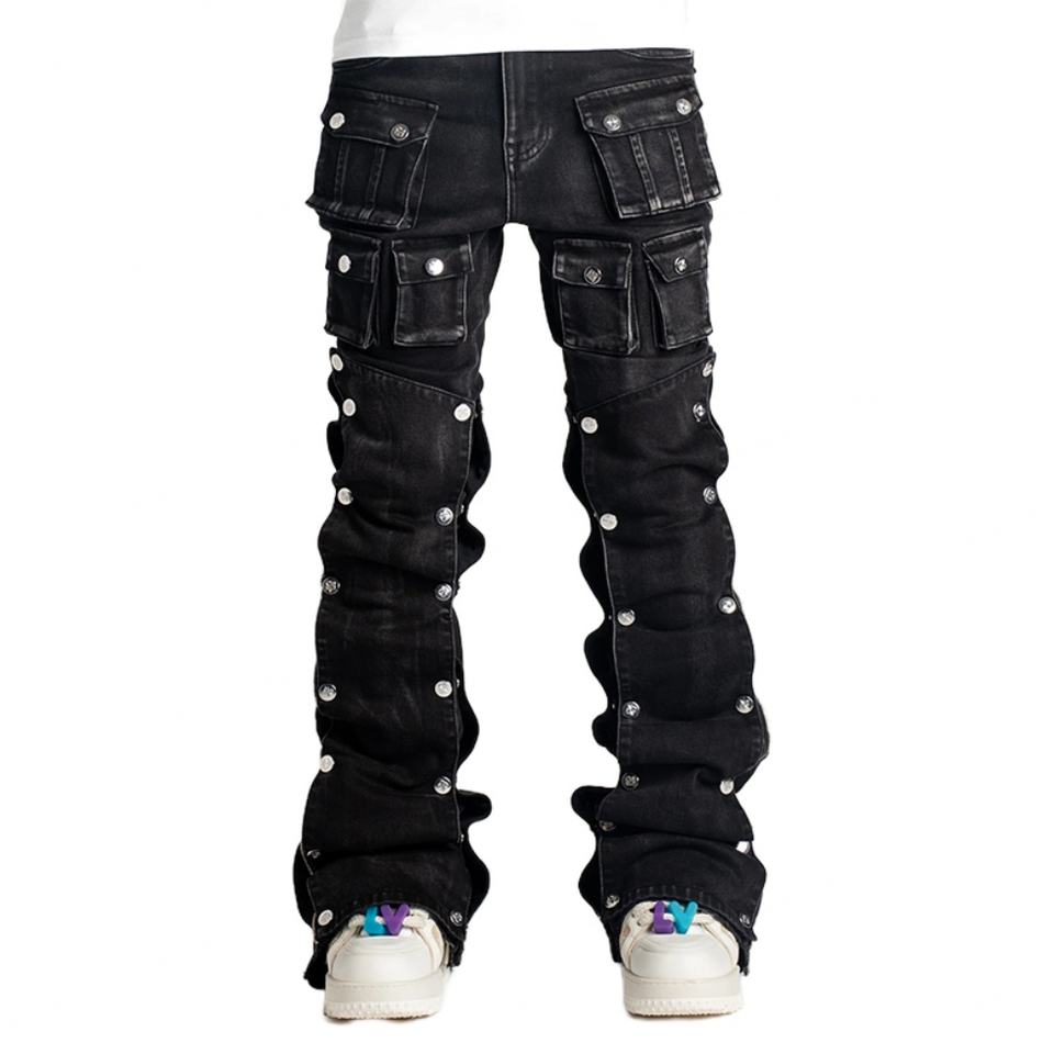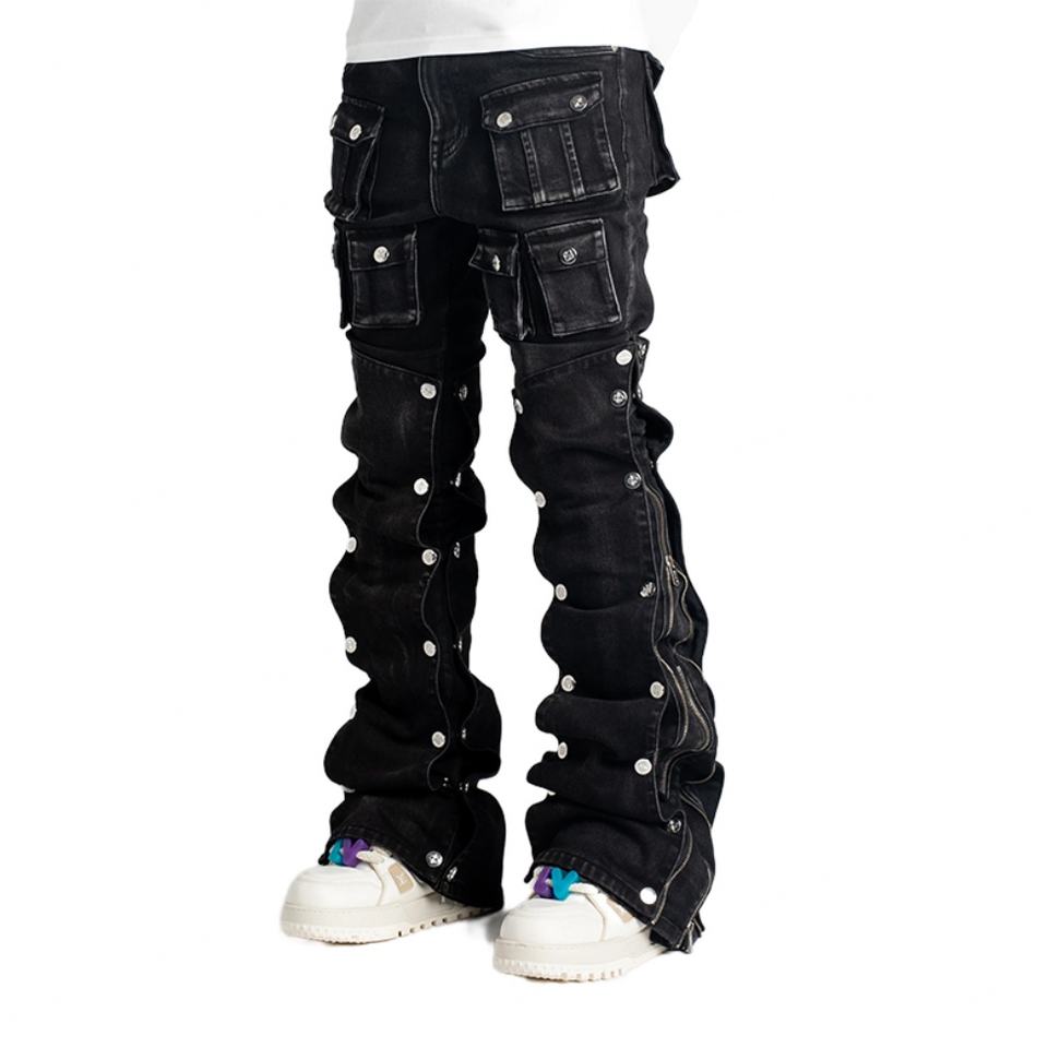 กางเกงยีนส์ฮิปฮอปดีไซน์ใหม่แบบสั่งทำพิเศษสำหรับผู้ชาย แต่งผ้าปะติดปะต่อพร้อมหัวเข็มขัดด้านข้างและซิป