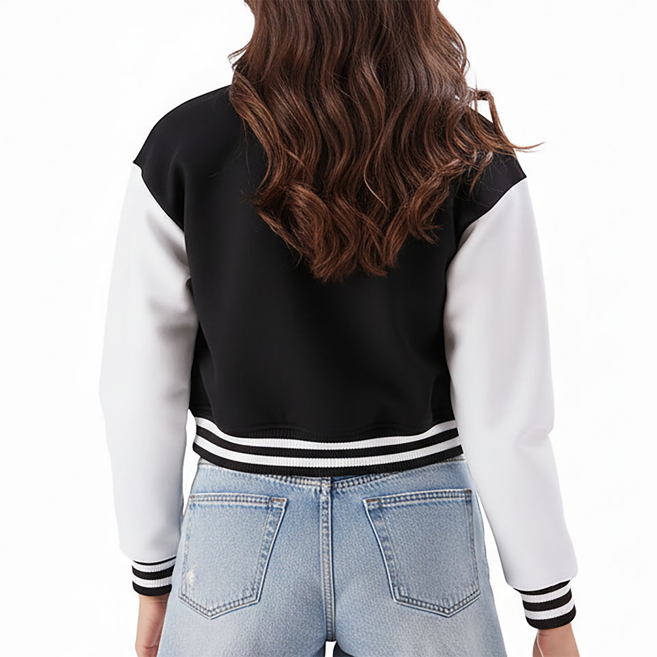 แจ็คเก็ตเบสบอลแบบใหม่สั่งทำพิเศษ OEM ขายส่งสำหรับผู้หญิง แขนยาว ระบายอากาศได้ดี ทรงครอปท็อป ผ้าหนา