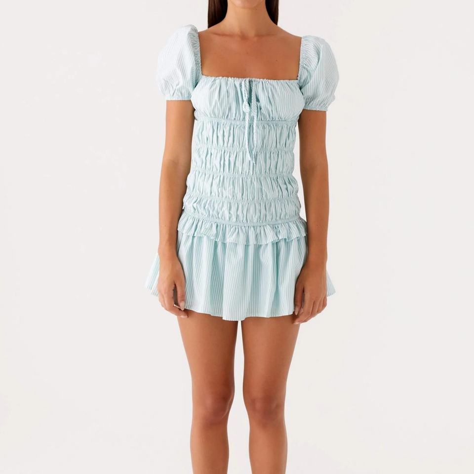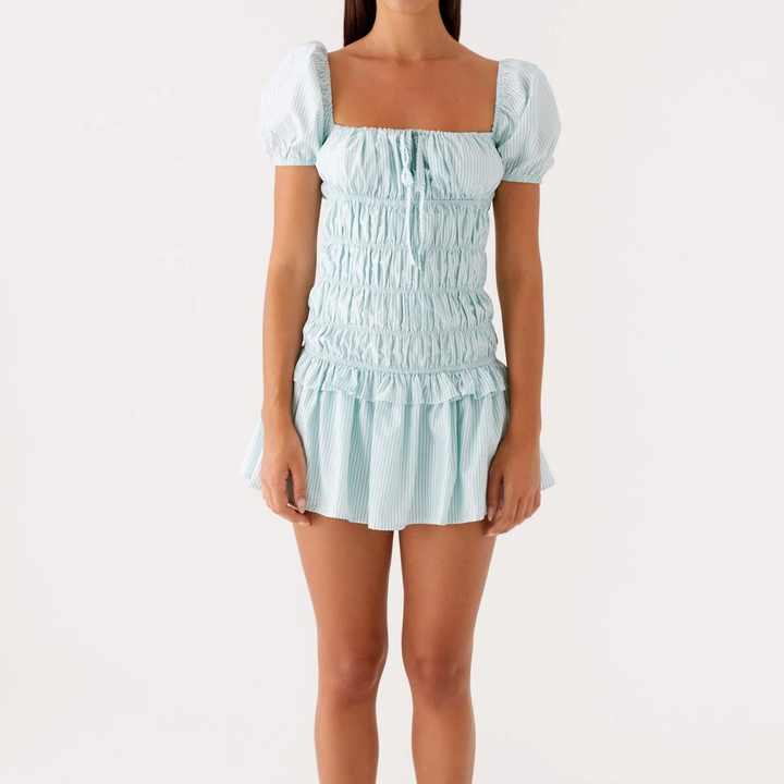 เดรสออกแบบใหม่ โลโก้สั่งทำได้ ชุดเดรสฤดูร้อนสำหรับผู้หญิง กระโปรงจีบระบาย แขนสั้น แต่งระบายช่วงอก มีกระเป๋าข้าง