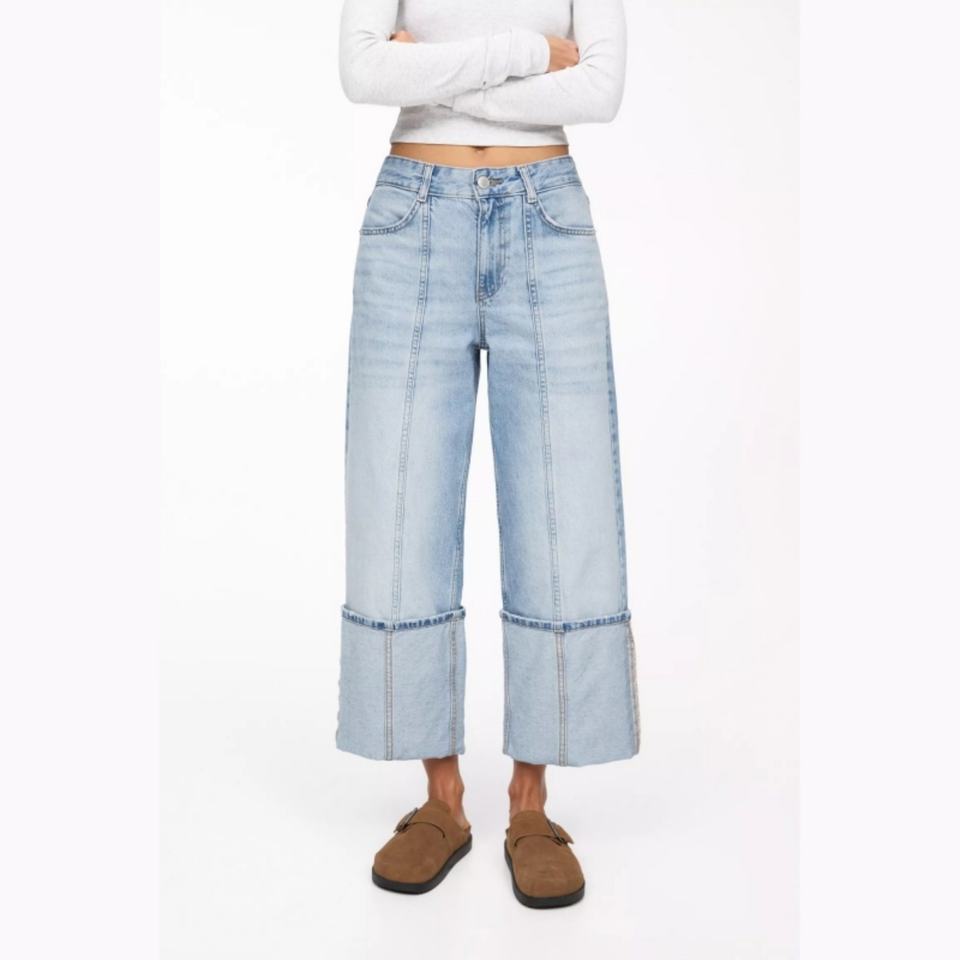 New Design Custom logo Women High Waist Wide Leg Jeans Turn-up Hem Light Blue Relaxed Fit Denim Pants