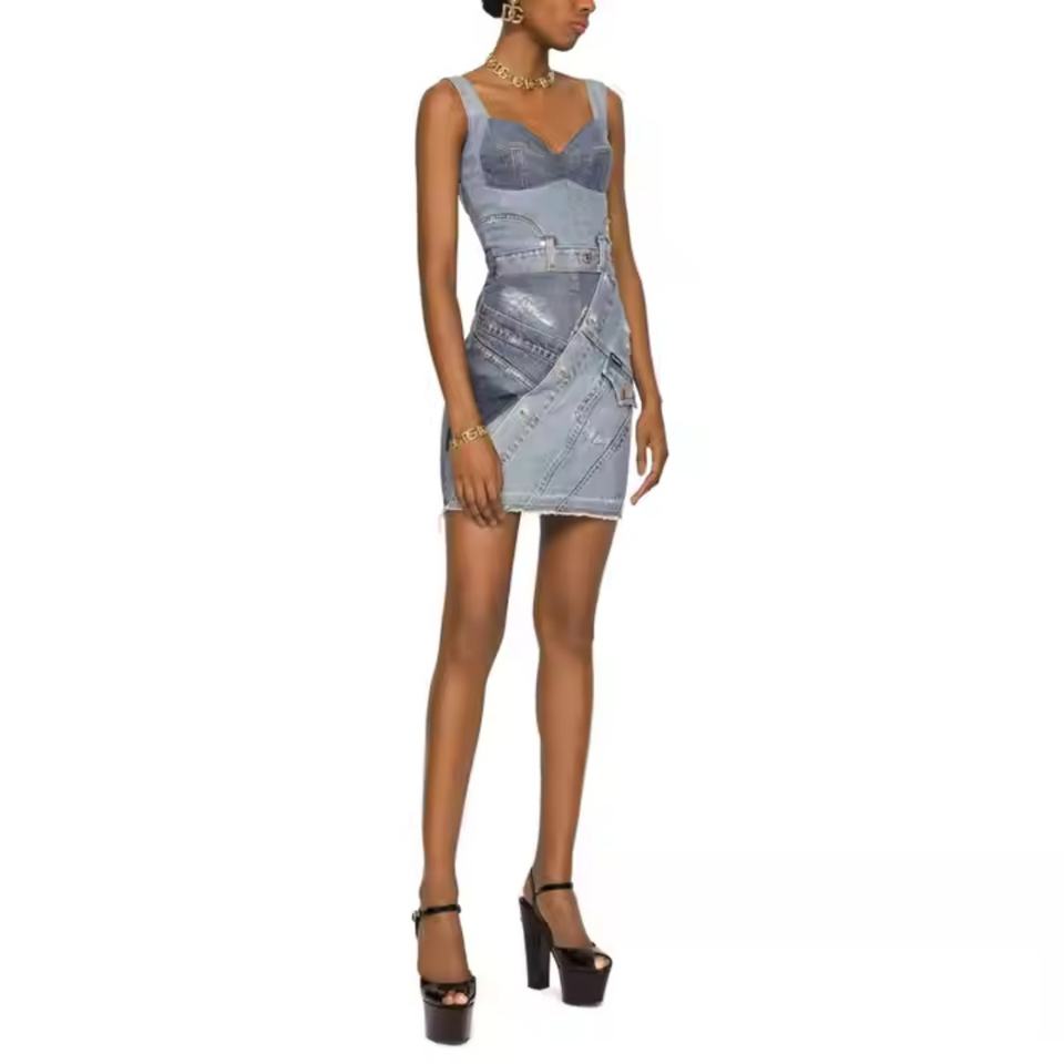 เดรสยีนส์ดีไซน์ใหม่สำหรับผู้หญิง สายเดี่ยวเซ็กซี่ สไตล์วินเทจ ล้างสีแบบเอซิด ยีนส์ฟอกสีซีด ทรงมินิเข้ารูป แต่งผ้าปะ สำหรับฤดูร้อน