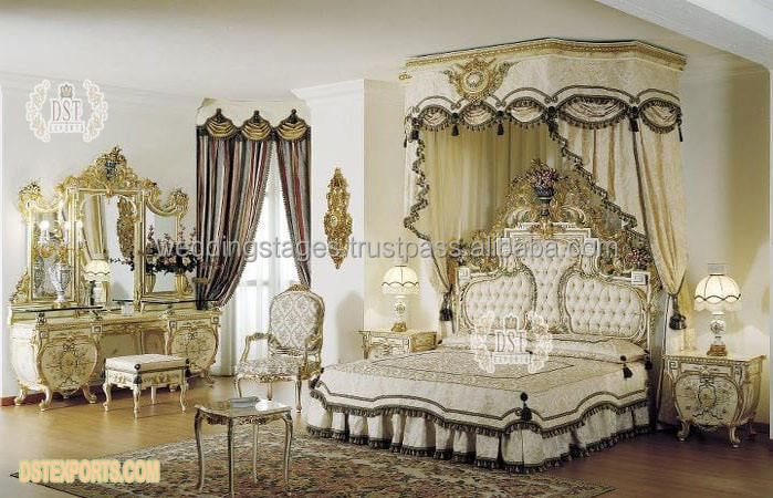 เตียงแกะสลักด้วยมือดีไซน์ใหม่พร้อมโต๊ะข้างเตียง เตียงคิงไซส์แกะสลักลายหรูหราพร้อมโต๊ะข้างเตียง ชุดห้องนอนสีทองเงาสูง สไตล์อเมริกัน