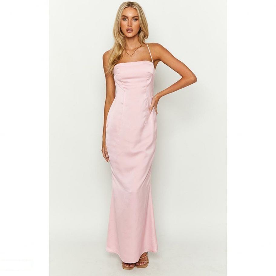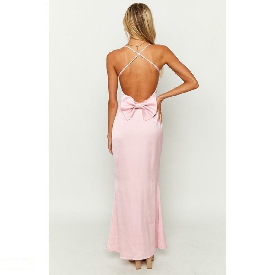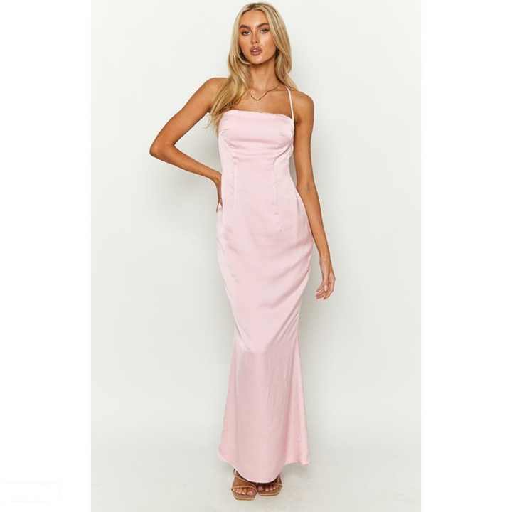 ชุดราตรีสีชมพูแบบใหม่ ดีไซน์รักษ์โลก ผ้าซาตินทอลาย แบบไม่มีแขน สายเดี่ยวผูกโบว์ ยาวกรอมพื้น