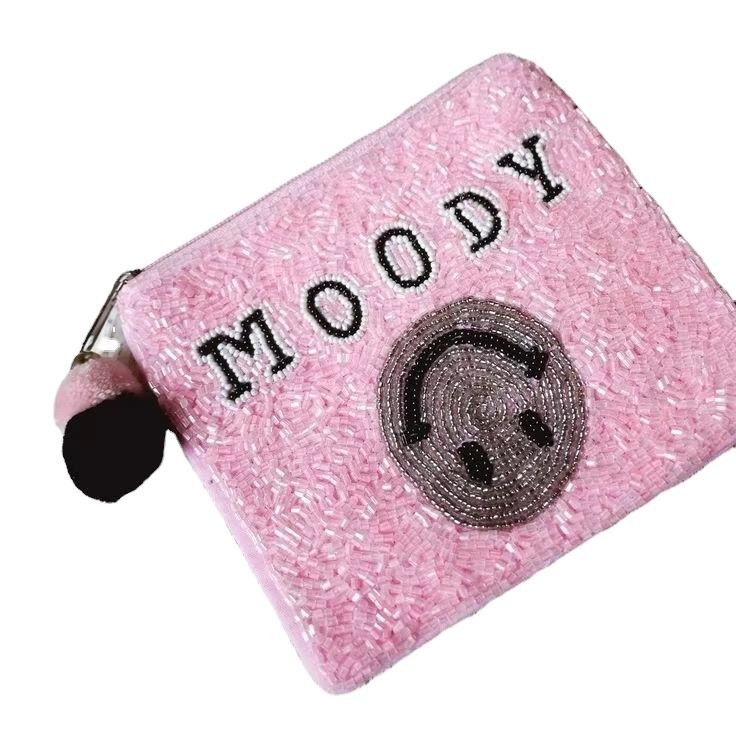 กระเป๋ามีซิปขนาดเล็กปักลายหน้าลูกปัดสีชมพูและสีดำหรูหรามีสไตล์ไม่เหมือนใครจากอินเดีย
