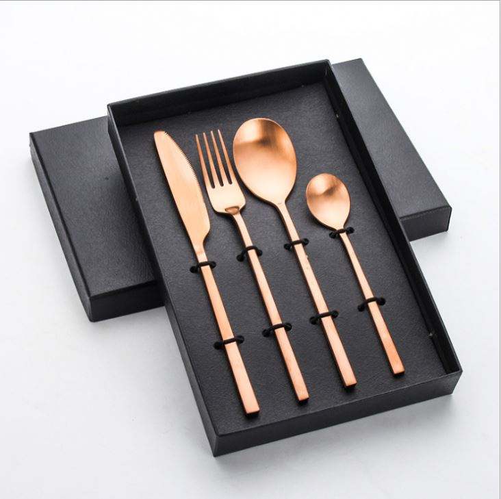 ชุดเครื่องใช้บนโต๊ะอาหารสแตนเลสเคลือบทอง PVD มีดช้อนส้อมหลากสีพร้อมกล่องดีไซน์ใหม่