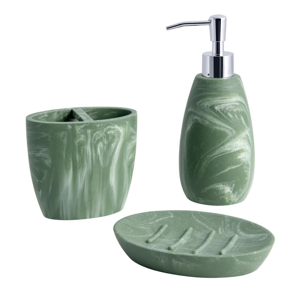 การออกแบบใหม่สีเขียวเรซิ่นห้องน้ำชุดผู้ถือและโลชั่นตู้ที่มีคุณภาพที่ดีที่สุดชุดห้องน้ำสำหรับราคาไม่แพง