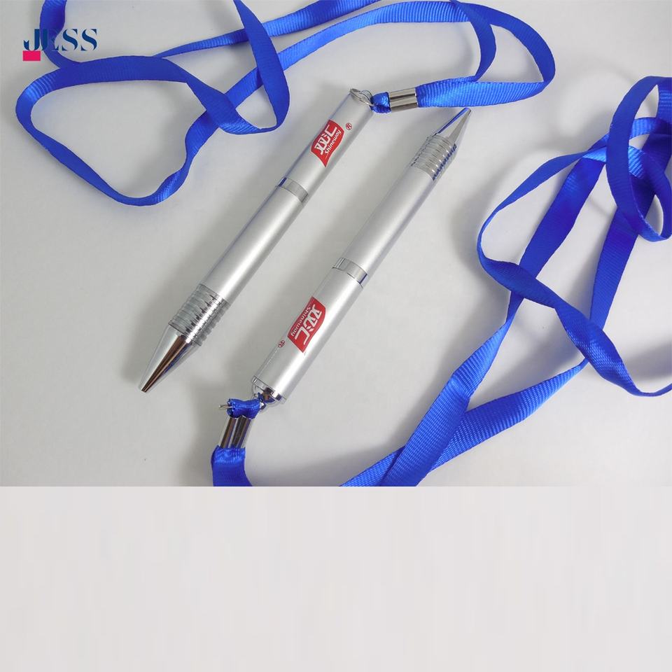 เชือกแขวนปากกาลูกลื่นปากกาเงินพร้อมเชือกสีน้ำเงินบนคอปากกาโลหะสำหรับแกะสลักโลโก้ที่กำหนดเองสำหรับโปรโมชั่นของขวัญดีไซน์ใหม่