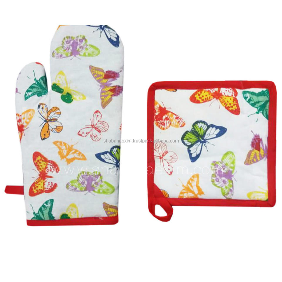New Design Heat-Resistant Butterfly Print Cotton Oven Mitts With Pot Holder Kitchen Gear for Baking and Cooking From India
