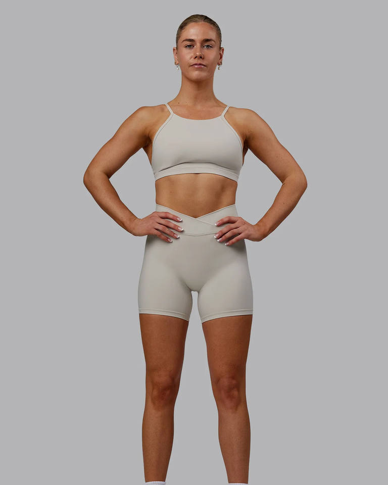 เซ็ตสปอร์ตบราและกางเกงขาสั้นสีเบจคอสูงของผู้หญิงชุดออกกำลังกายเล่นยิมระบายอากาศได้ดีชุดเซ็ต2ชิ้นสำหรับชายหาดฤดูร้อน