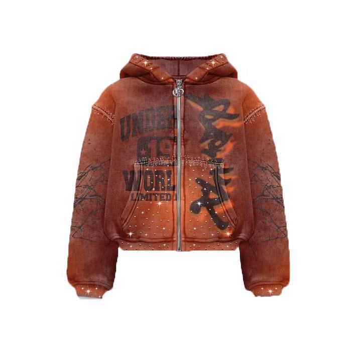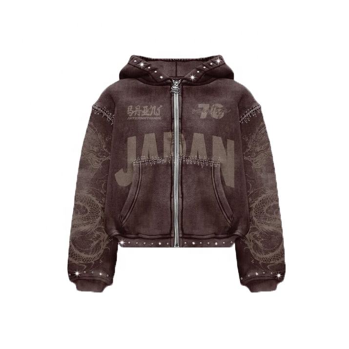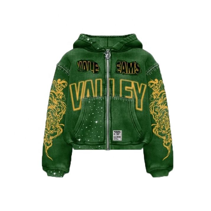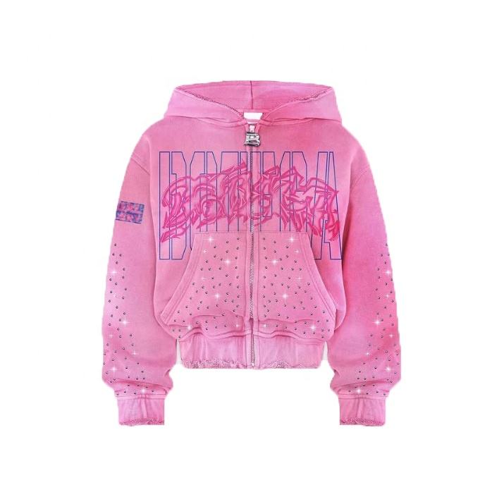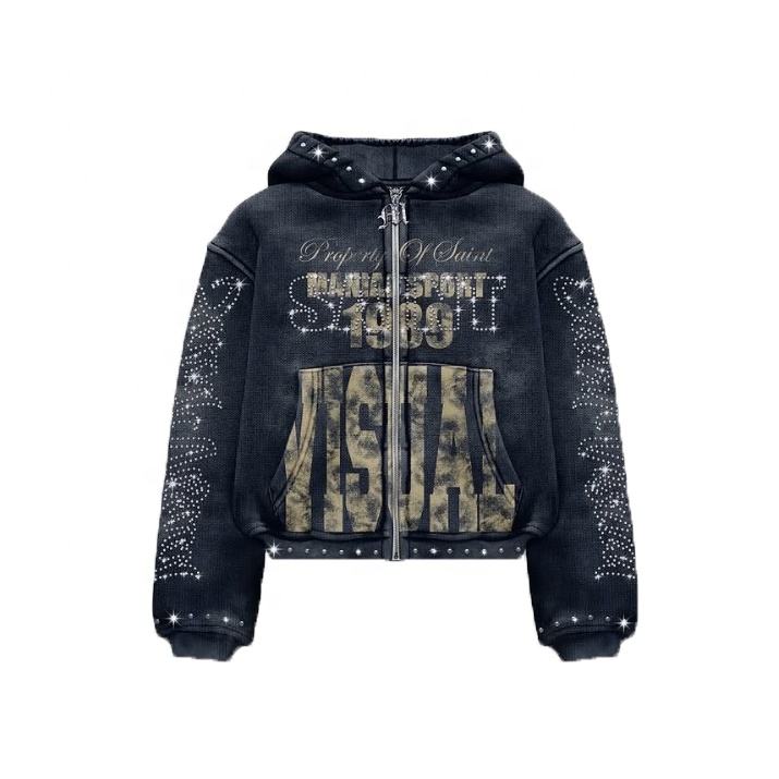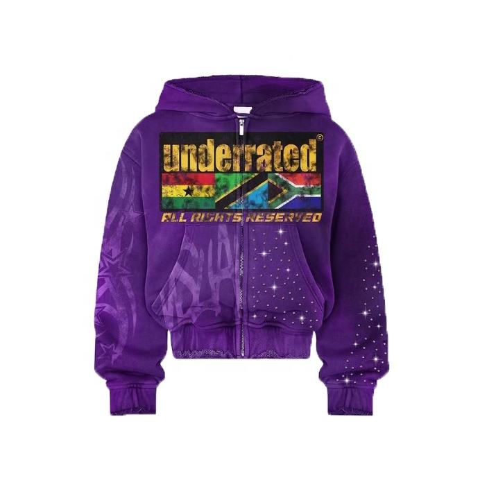 New Design High Quality Rhinestone Printed Zipper Hoodies Man 100% Cotton Custom Made Regular Fit Distressed Sweatshirt