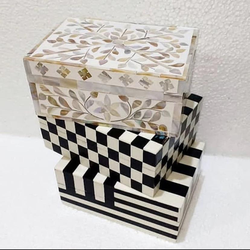 การออกแบบใหม่อินเดียทําด้วยมือ MDF กระดูกเรซิ่นทรงสี่เหลี่ยมสีดําและสีขาวกล่องของขวัญของขวัญพรรคสํานักงานใช้การออกแบบที่สวยงาม