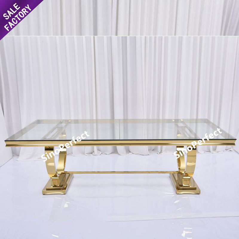 โต๊ะจัดเลี้ยงงานแต่งงาน ดีไซน์ใหม่ หรูหรา ขาสีทอง โต๊ะทรงสี่เหลี่ยมผืนผ้า กระจก โมเดิร์น สแตนเลส