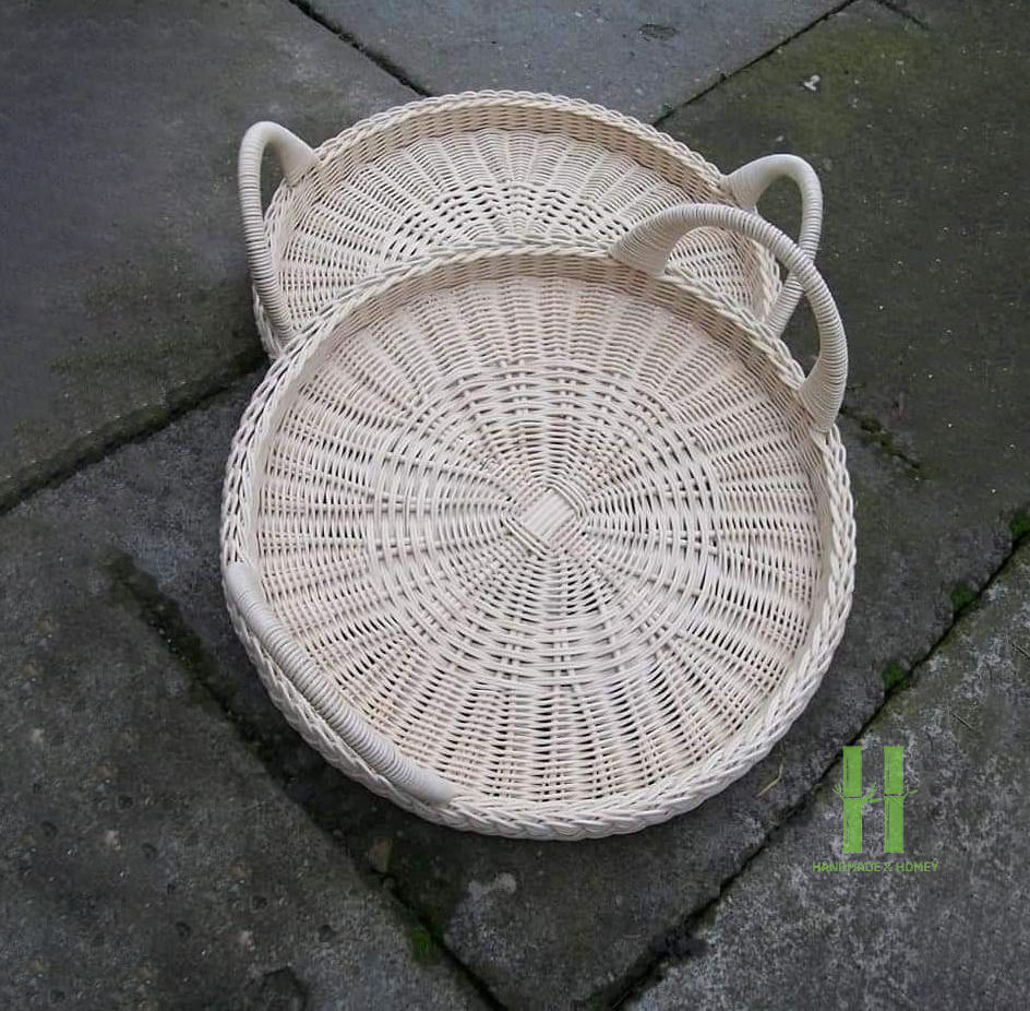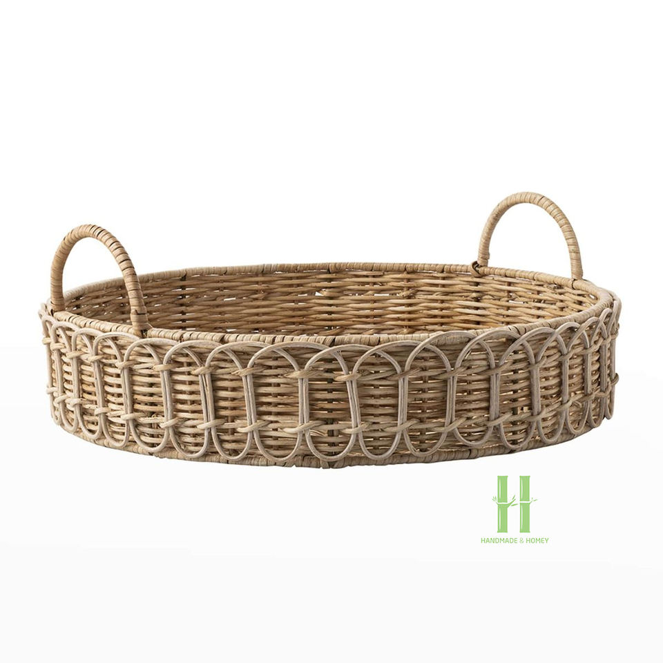 ถาดเสิร์ฟหวายดีไซน์ใหม่สุดหรูสไตล์วินเทจทรงกลม พร้อมหูจับไม้ สำหรับใส่อาหาร เครื่องดื่ม และเครื่องสำอาง