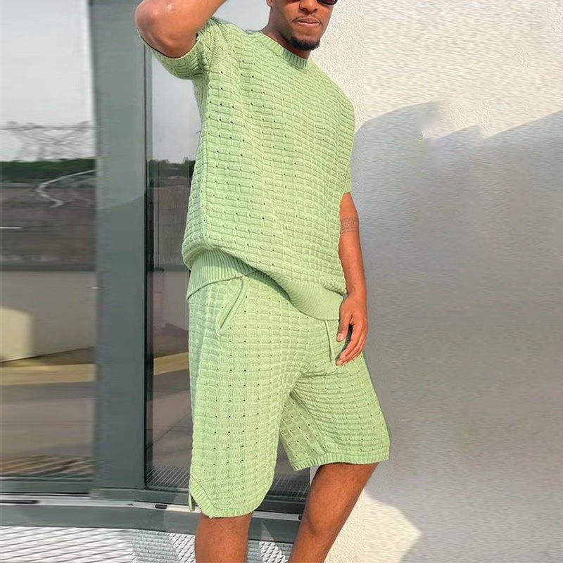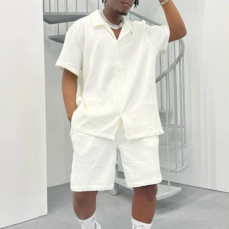 เสื้อเชิ้ตชุดเซ็ตผู้ชายสไตล์สตรีทแวร์สำหรับฤดูร้อน ดีไซน์ใหม่ (2 ชิ้น) ผ้าฝ้ายวาฟเฟิล 100% ระบายอากาศได้ดี สีพื้น ย้อมแบบวินเทจ สไตล์ลำลอง