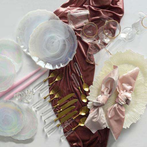 ชุดช้อนส้อมโลหะดีไซน์แบบราชวงศ์พร้อมด้ามอะคริลิคใสสีทองสำหรับบ้านและร้านอาหารชุดเครื่องใช้บนโต๊ะอาหาร