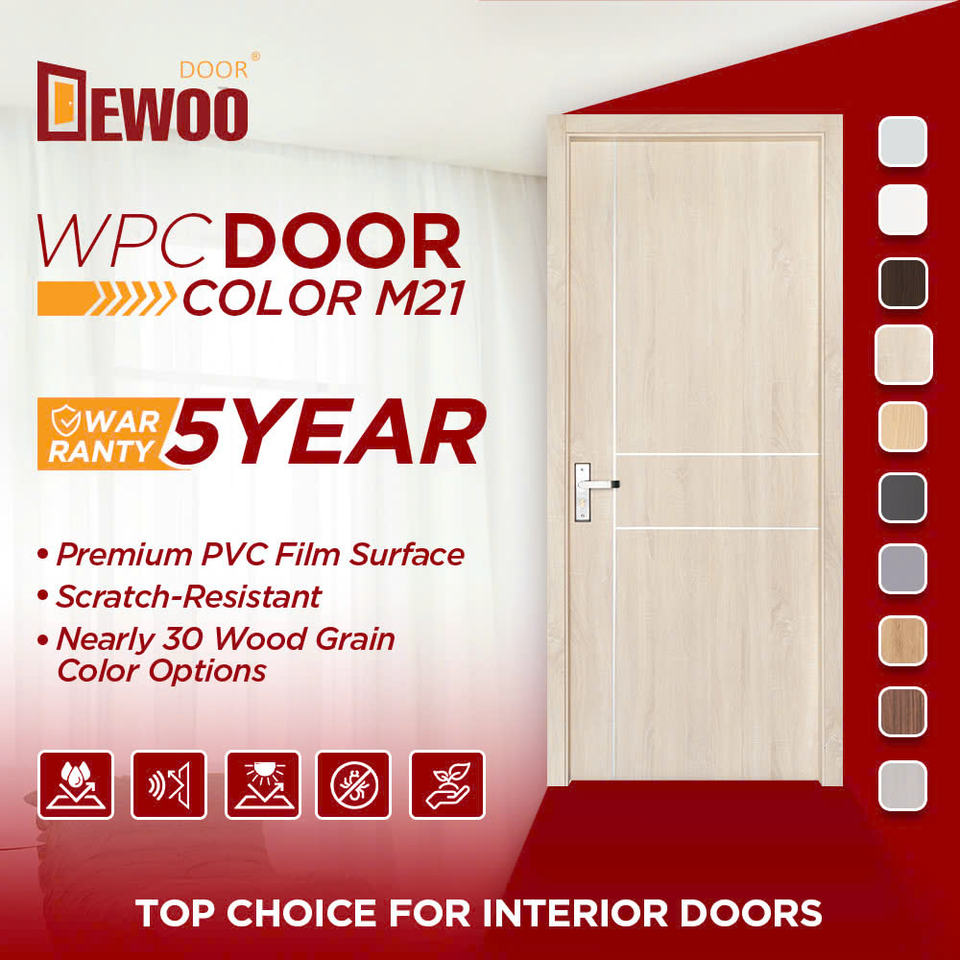 ประตูไม้ WPC ดีไซน์ใหม่ เรียบง่าย ทันสมัย กันน้ำ ยี่ห้อ DEWOO DOOR รับประกัน 5+ ปี สำหรับห้องน้ำ ห้องนอน ห้องครัว โรงแรม