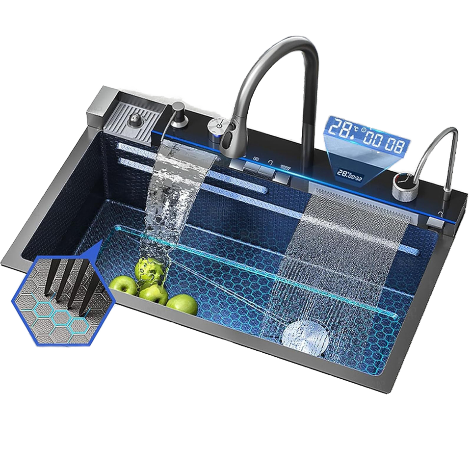 อ่างล้างจานนาโนสีดำอเนกประสงค์ดีไซน์ใหม่สำหรับห้องครัวไฟ LED น้ำตกอ่างล้างจานทำด้วยมือ304สแตนเลสอ่างล้างจานเดี่ยว
