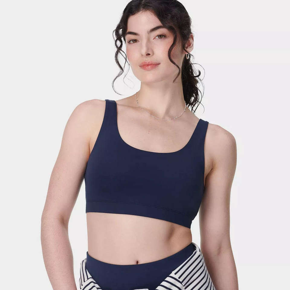 ชุดออกกำลังกายสปอร์ตบราผู้หญิง ดีไซน์ใหม่ ผ้าไนลอนผสมสแปนเด็กซ์ ชายเสื้อโค้งมน พร้อมแผ่นรองถอดได้