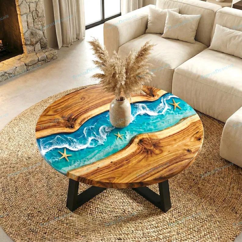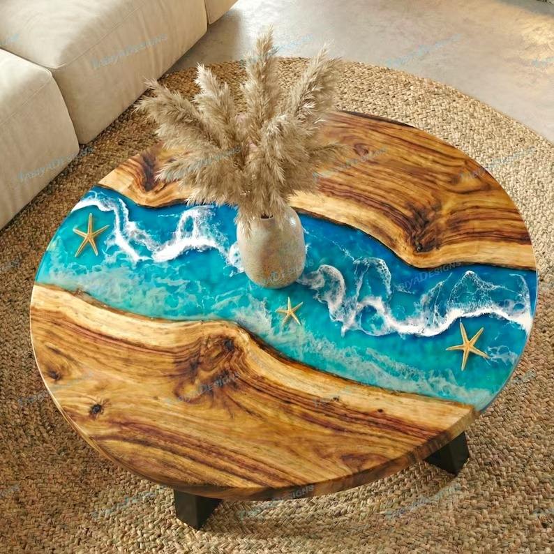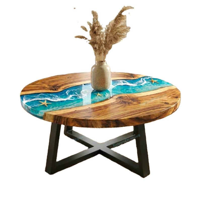 โต๊ะรับประทานอาหารรูปทรงใหม่สำหรับกลางแจ้ง โต๊ะกาแฟทรงกลม โต๊ะทรงสี่เหลี่ยมผืนผ้า ทำจากเรซิ่นอีพ็อกซี่และไม้เนื้อแข็ง สำหรับร้านอาหาร นำเข้าจากอินเดีย
