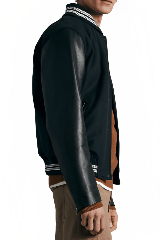 แจ็คเก็ตวาร์ซิตี้สีดำดีไซน์ใหม่ ผ้าโพลีเอสเตอร์ คอริบบ์ กระดุมติด และตัวอักษรแบบ Letterman สไตล์เบสบอลวิทยาลัย