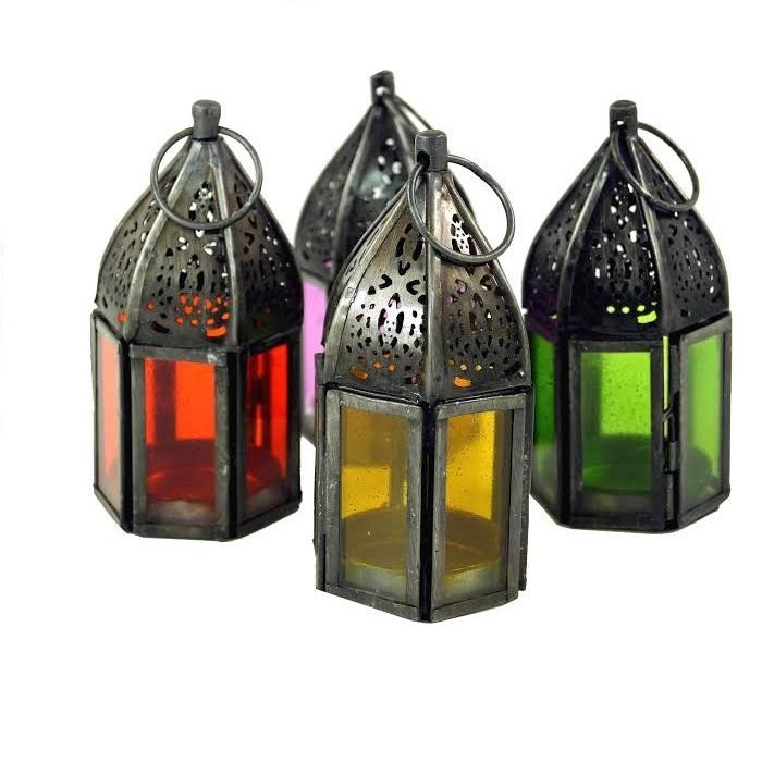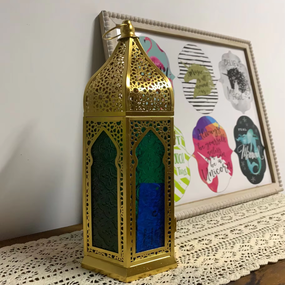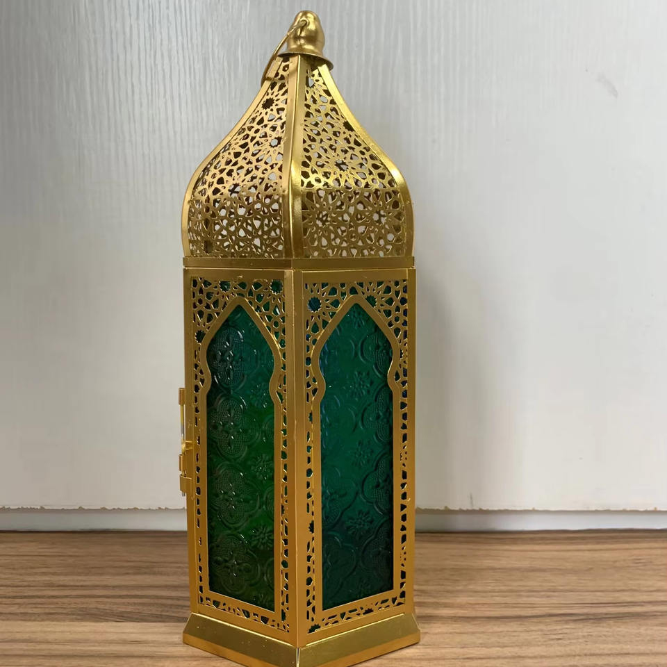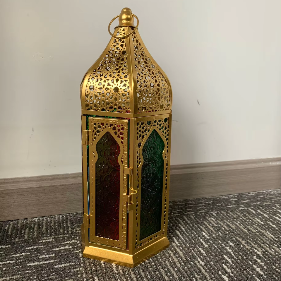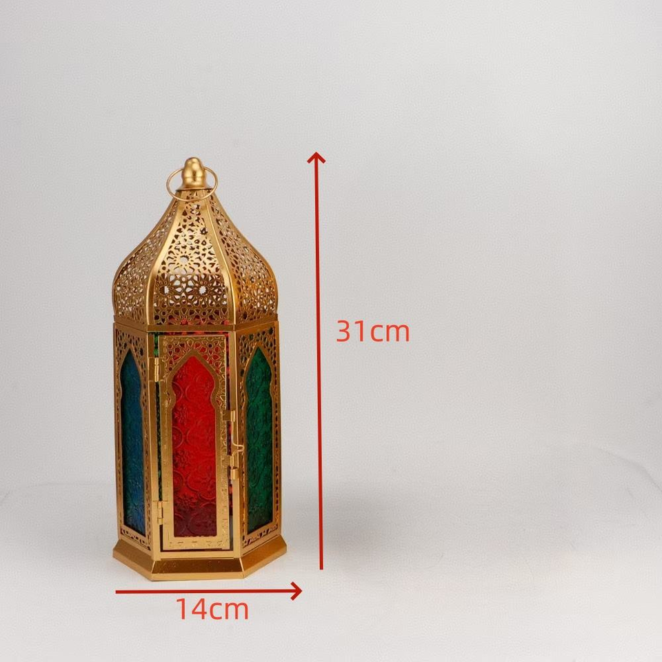 โคมไฟรอมฎอนดีไซน์ใหม่ โคมไฟโลหะรูปหกเหลี่ยม ตกแต่งเทศกาล พร้อมกระจกหลากสี