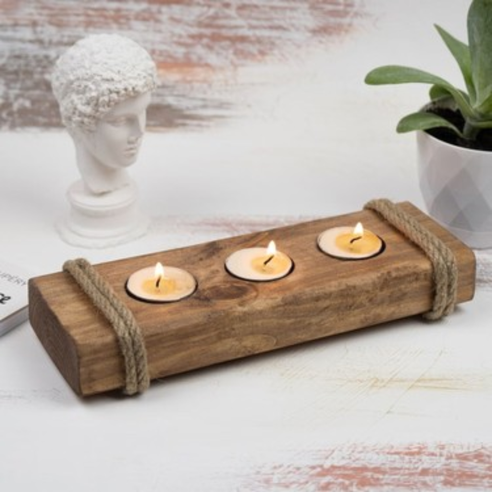 ที่วางเทียนทีไลท์ไม้สไตล์เรสติก ดีไซน์ใหม่ งานแฮนด์เมด ถาดใส่เทียนทีไลท์ 3 ดวง จากเวียดนาม