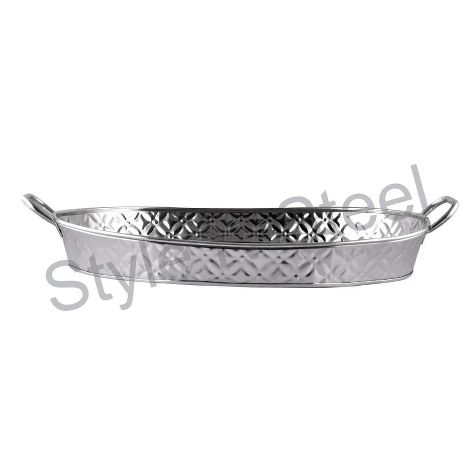 ถาดเสิร์ฟอาหารทรงกลมดีไซน์ใหม่ถาดเสิร์ฟบาร์ชุบสังกะสีพร้อมที่จับลายดอกไม้