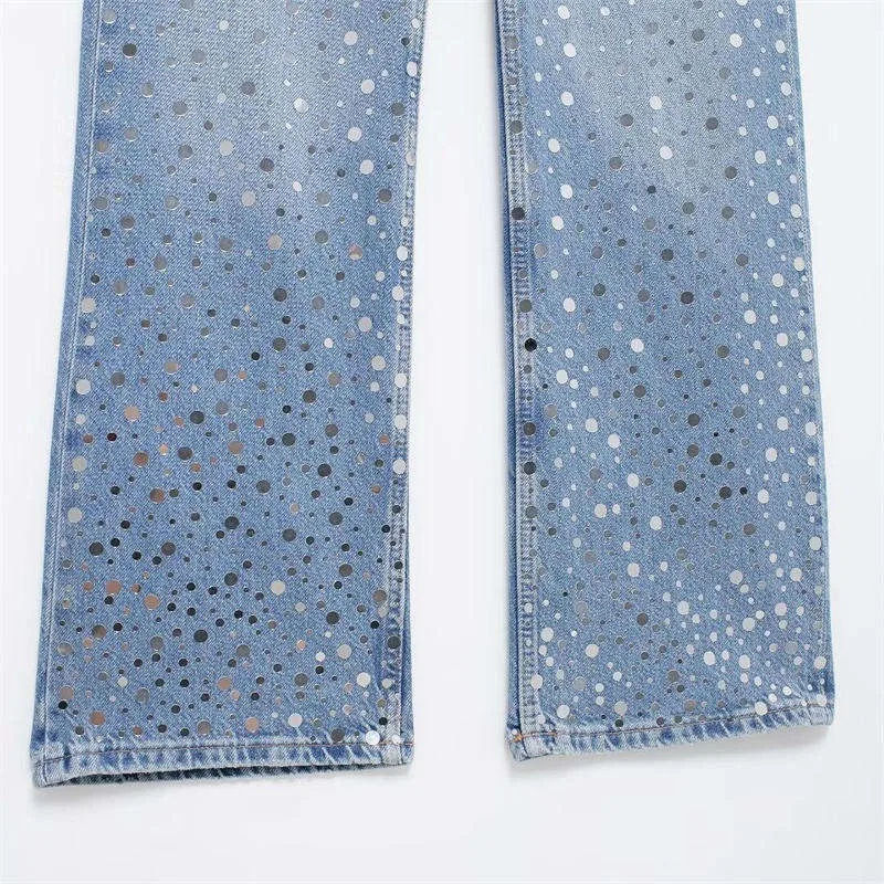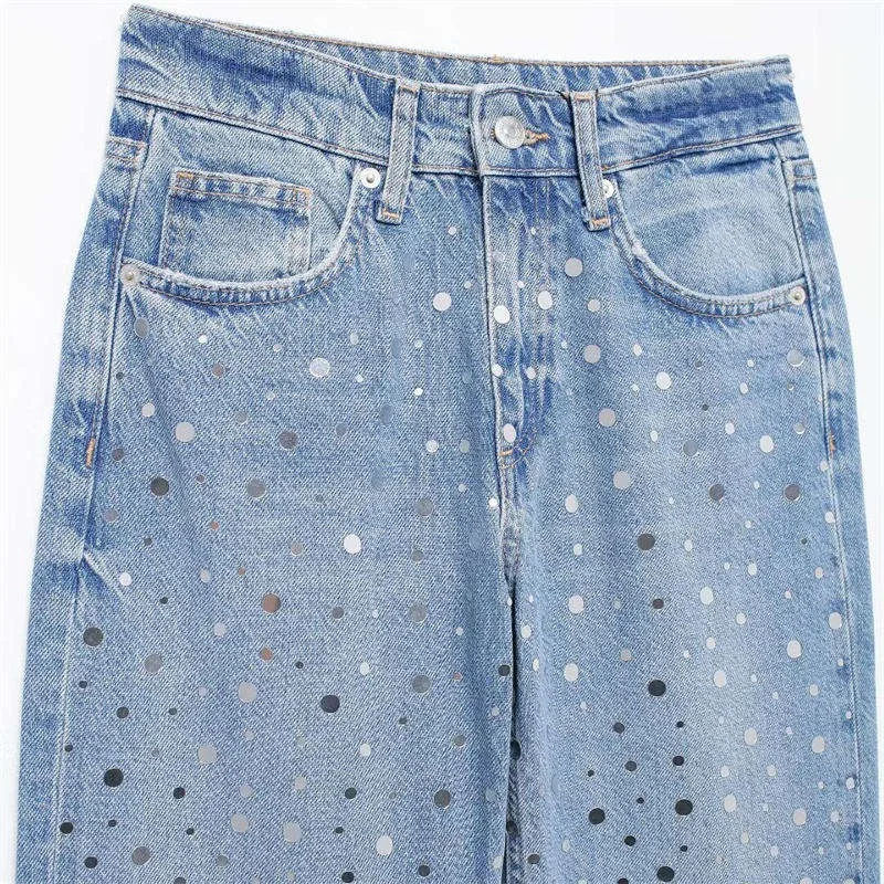 กางเกงยีนส์ผู้ชายดีไซน์ใหม่ประดับคริสตัลวิบวับ สไตล์ลำลองทรงสลิม ผ้าฝ้าย 100% กางเกงยีนส์ผู้หญิงแบบสั่งทำพิเศษ ล้างสีพร้อมตกแต่งหมุดและคริสตัล