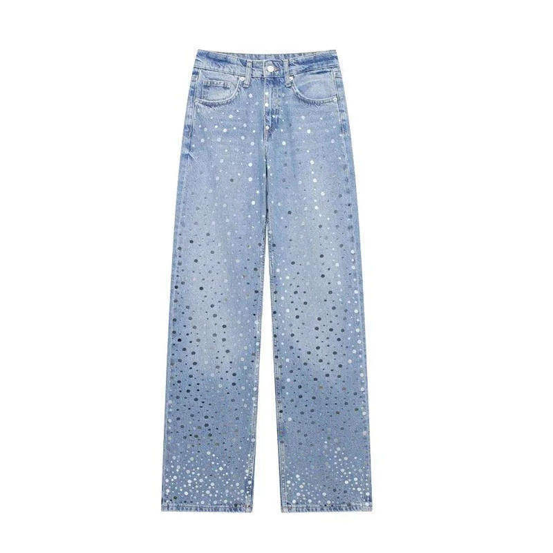 กางเกงยีนส์ผู้ชายดีไซน์ใหม่ประดับคริสตัลวิบวับ สไตล์ลำลองทรงสลิม ผ้าฝ้าย 100% กางเกงยีนส์ผู้หญิงแบบสั่งทำพิเศษ ล้างสีพร้อมตกแต่งหมุดและคริสตัล