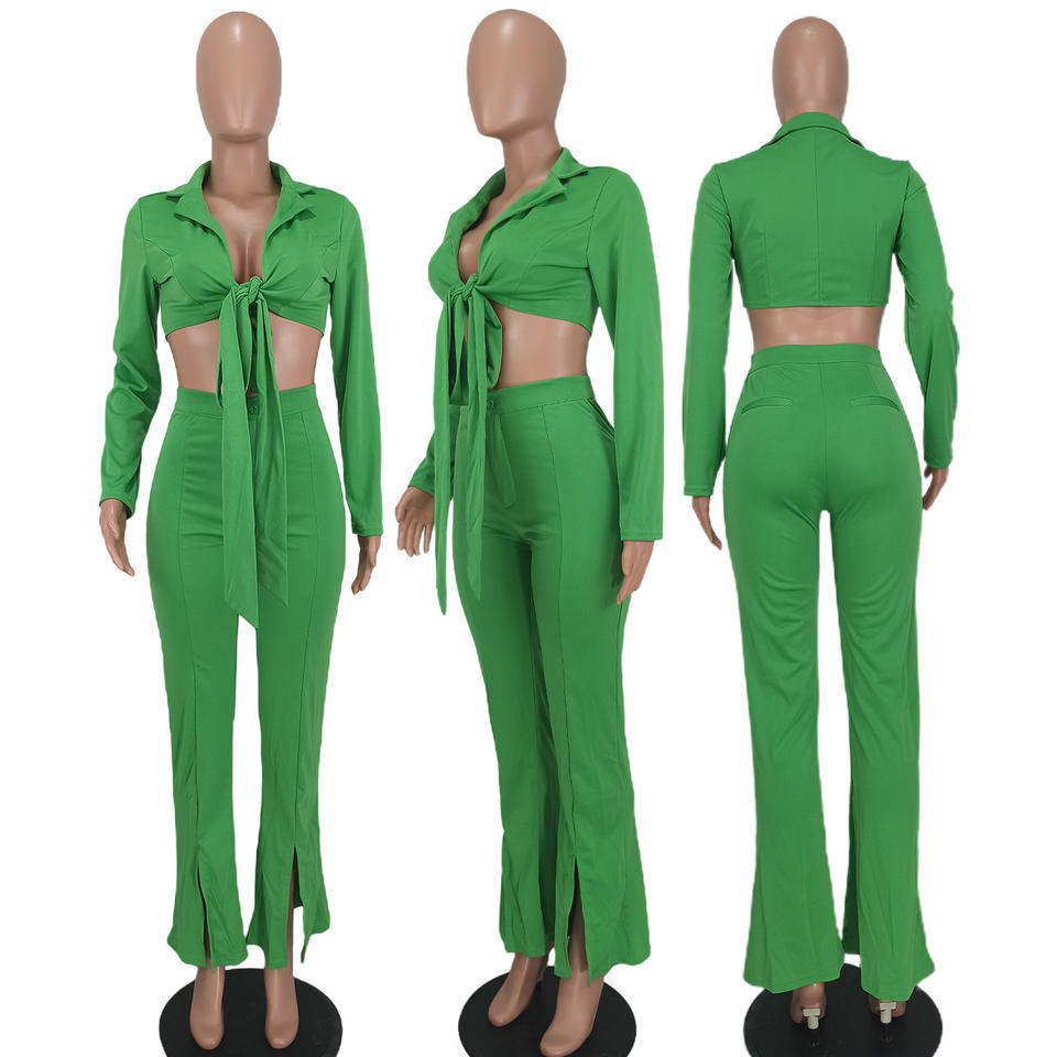 ชุดเซ็ตสองชิ้นแฟชั่นสำหรับสาวสูง ดีไซน์ใหม่ เสื้อแขนยาว กางเกงขาบาน