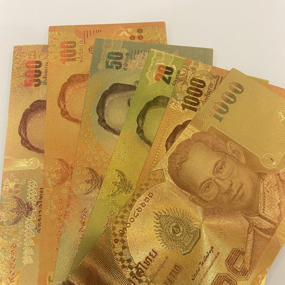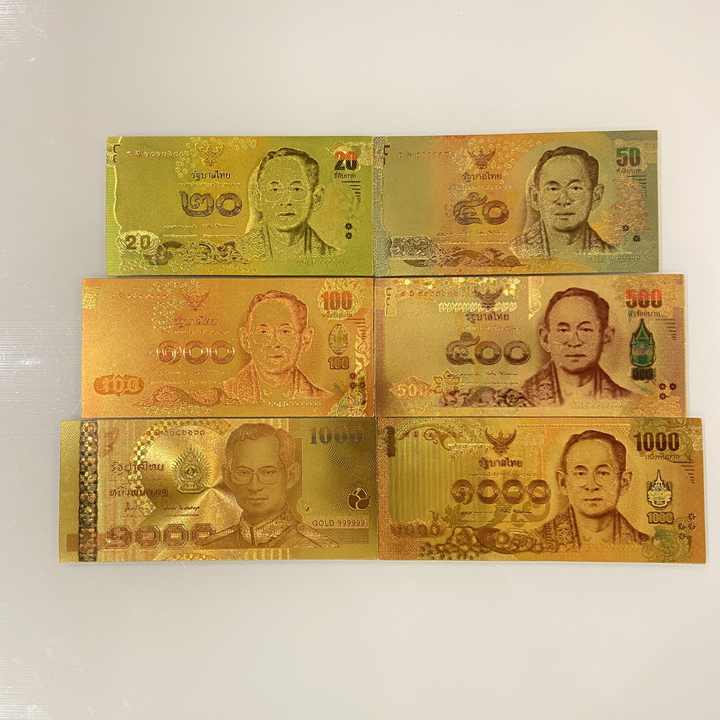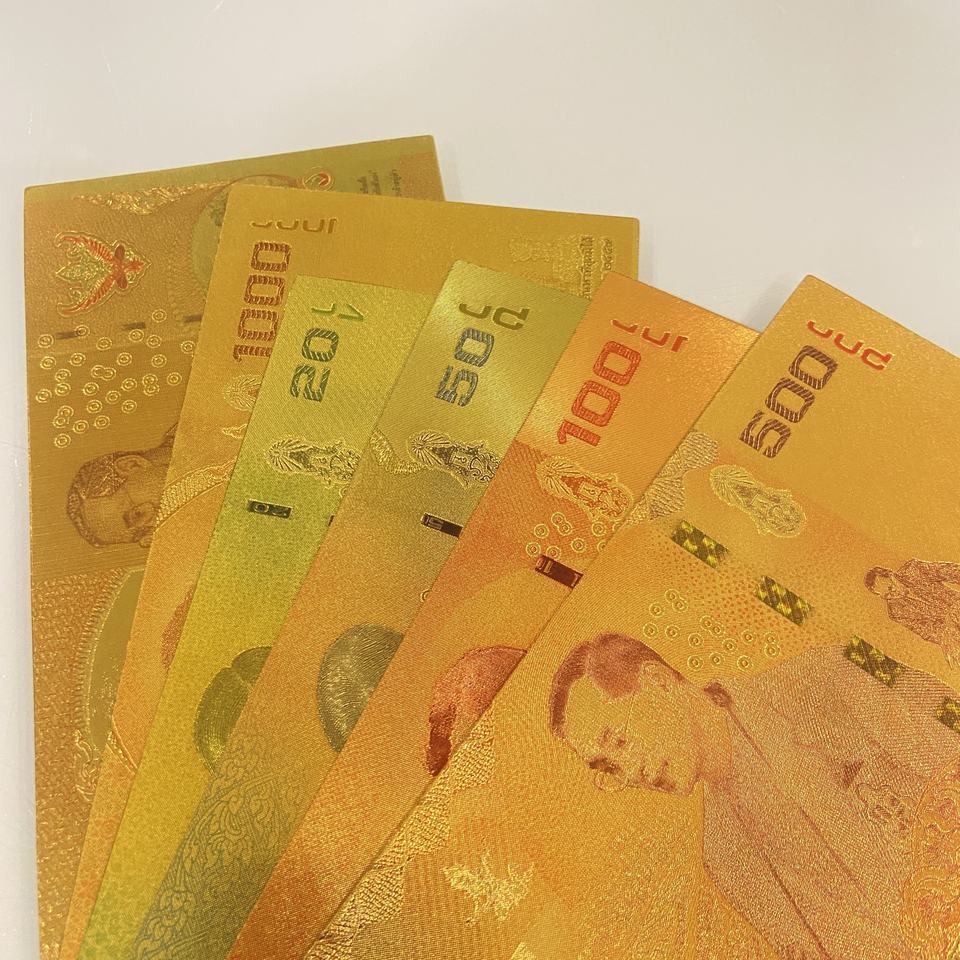 ชุดธนบัตรไทยดีไซน์ใหม่ 6 ใบ ค่า 20 50 100 500 1000 ชุบทองคำ 24K แบบสองด้าน สำหรับงานอีเว้นท์และปาร์ตี้