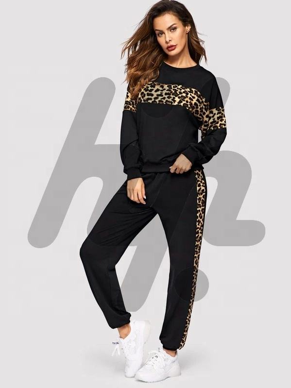 New Design Women Leopard Panel Windproof Breathable Pullover Joggers Set Long Sleeve Drop Shoulder Neck Multicolor Winter