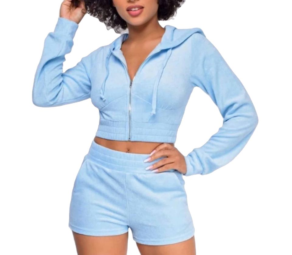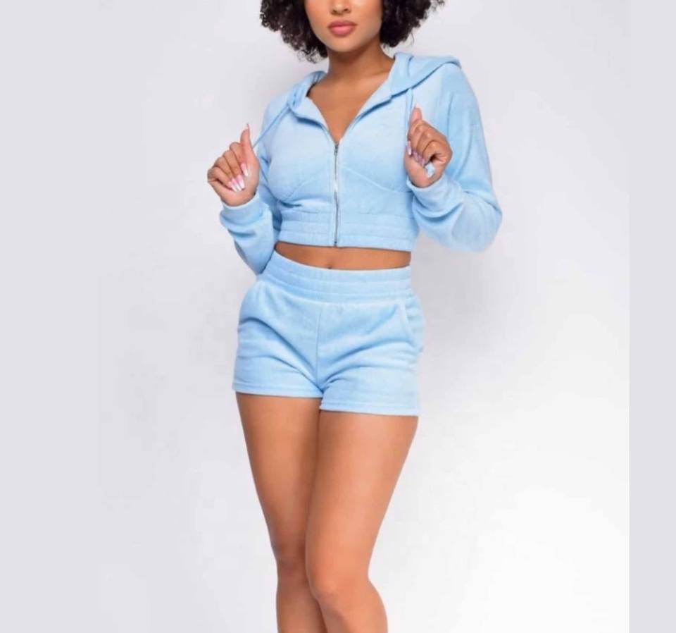 ชุดเซ็ตฮู้ดดี้ครอปซิปและกางเกงขาสั้นสำหรับผู้หญิง ดีไซน์ใหม่ แบบสั่งทำได้ OEM เสื้อท่อนบนแบบดิสเทรสสีพื้น และกางเกงขาสั้นตะเข็บต่ำ OEM ชุดเซ็ตผ้าฝ้าย 100%