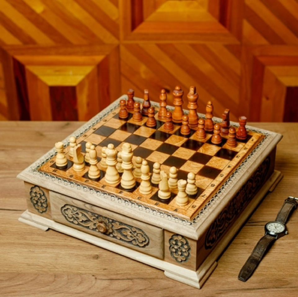 ชุดหมากรุกไม้พร้อมมงกุฎทองเหลือง
