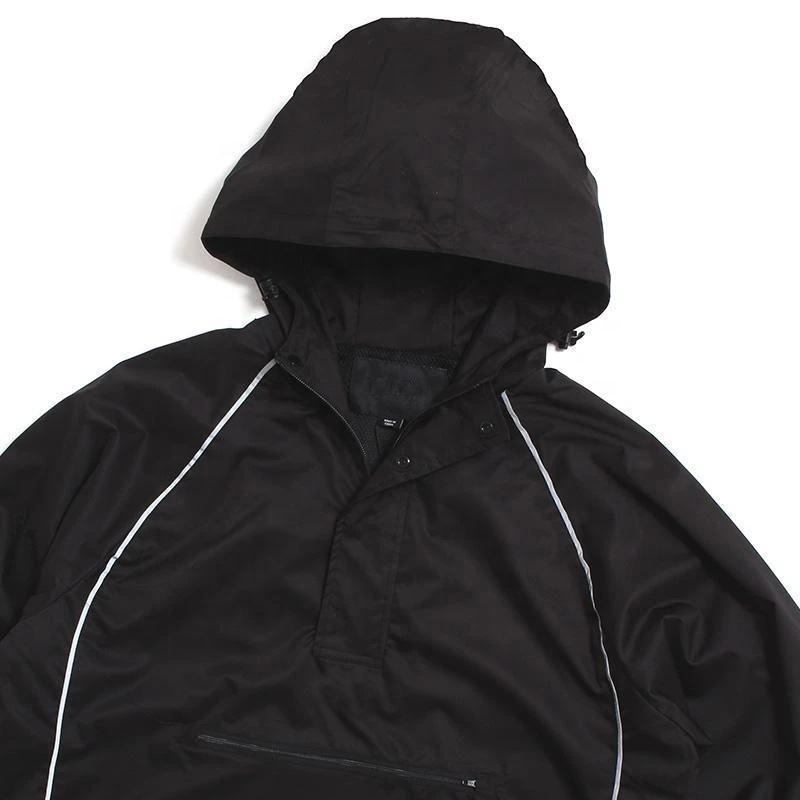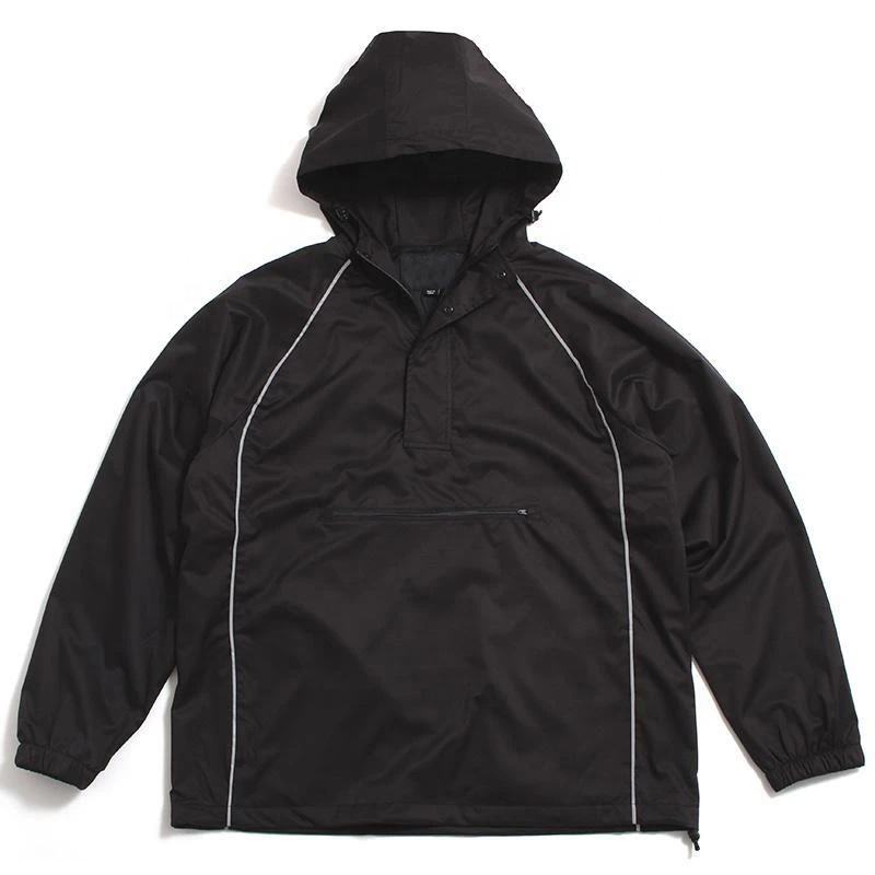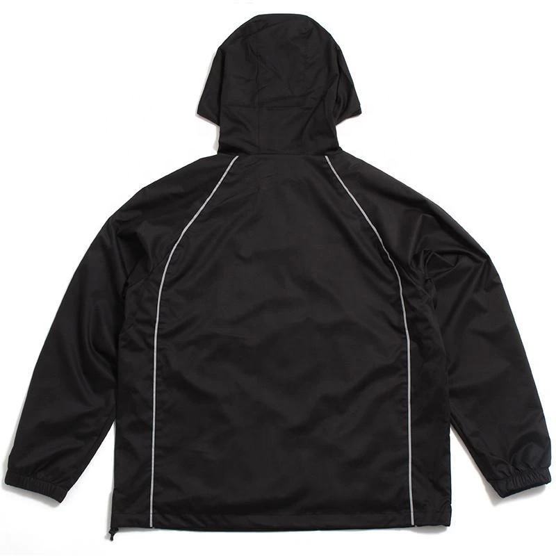 เสื้อแจ็คเก็ตวินด์เบรกเกอร์แบบสวม รุ่นวินเทจ ปี 2025 ดีไซน์ใหม่ ผ้าทอเคลือบ คอตั้ง แต่งแถบสะท้อนแสง ซิปหน้า สีดำ มีกระเป๋า