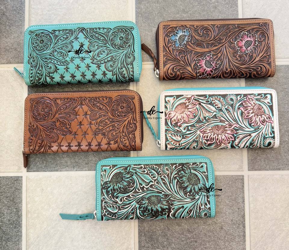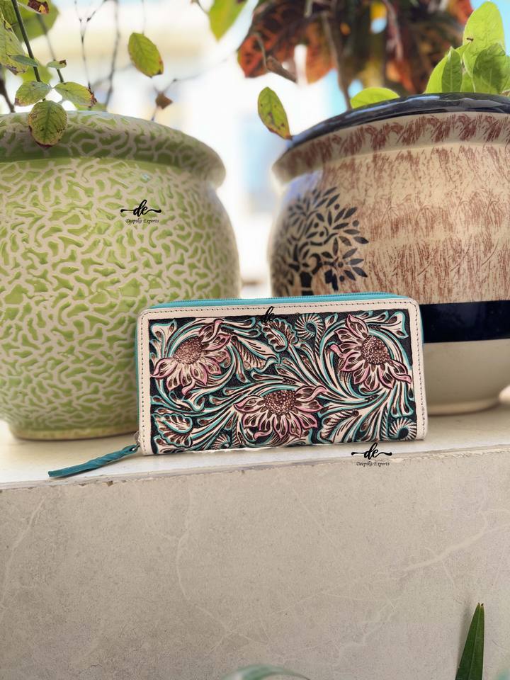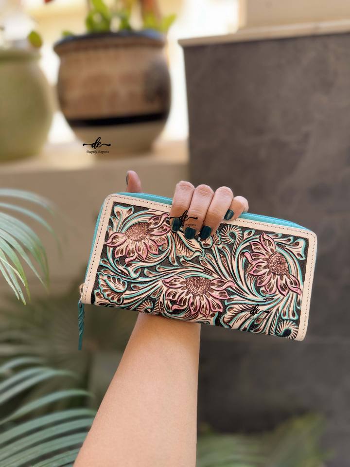 กระเป๋าคลัทช์แกะสลักมือดีไซน์ใหม่เคสโทรศัพท์กระเป๋าสตางค์หนังตะวันตกสีเทอร์ควอยซ์มีสไตล์สำหรับผู้หญิงใช้งานได้หลากหลาย