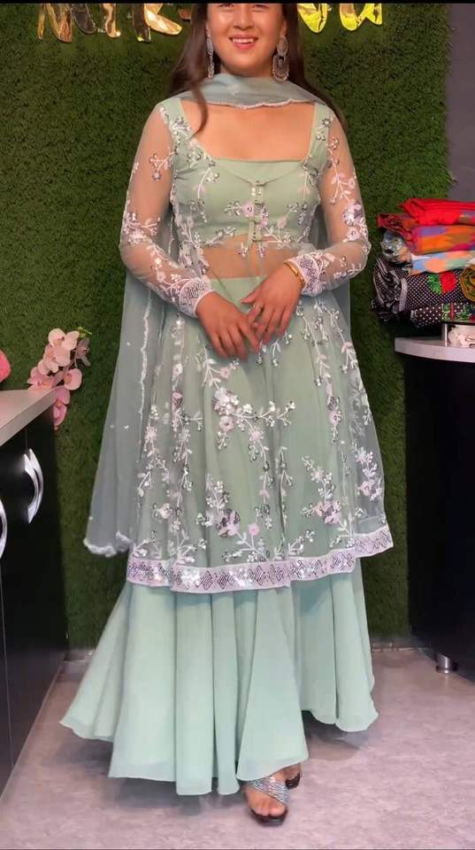 คอลเลกชันใหม่ออกแบบโดยดีไซเนอร์แบบนิ่มตาข่ายปักลาย Koti faux georgette choli และ Palazzo พร้อมตาข่าย dupatta ราคาขายส่ง