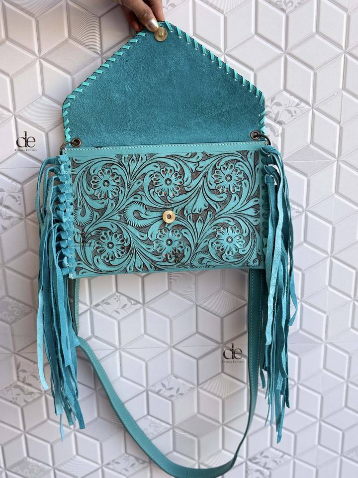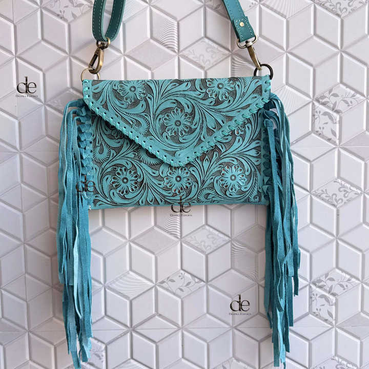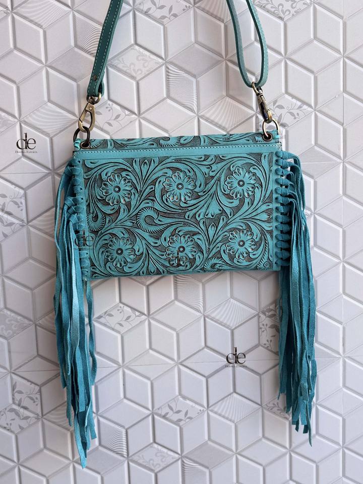 New Designer Hand Tooled Fringe Handbag Real Leather Handmade Carving Tooling Turquoise Color Sling Bag Western Stylish Bags
