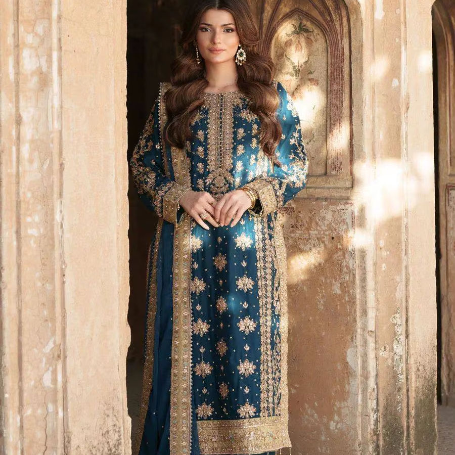 ชุดออร์แกนซ่าปักลายหนักแบบใหม่สำหรับสุภาพสตรี สไตล์อินเดีย ผ้าฝ้ายพร้อมกางเกงซัลวาร์ ชุดงานเลี้ยง ราคาประหยัด